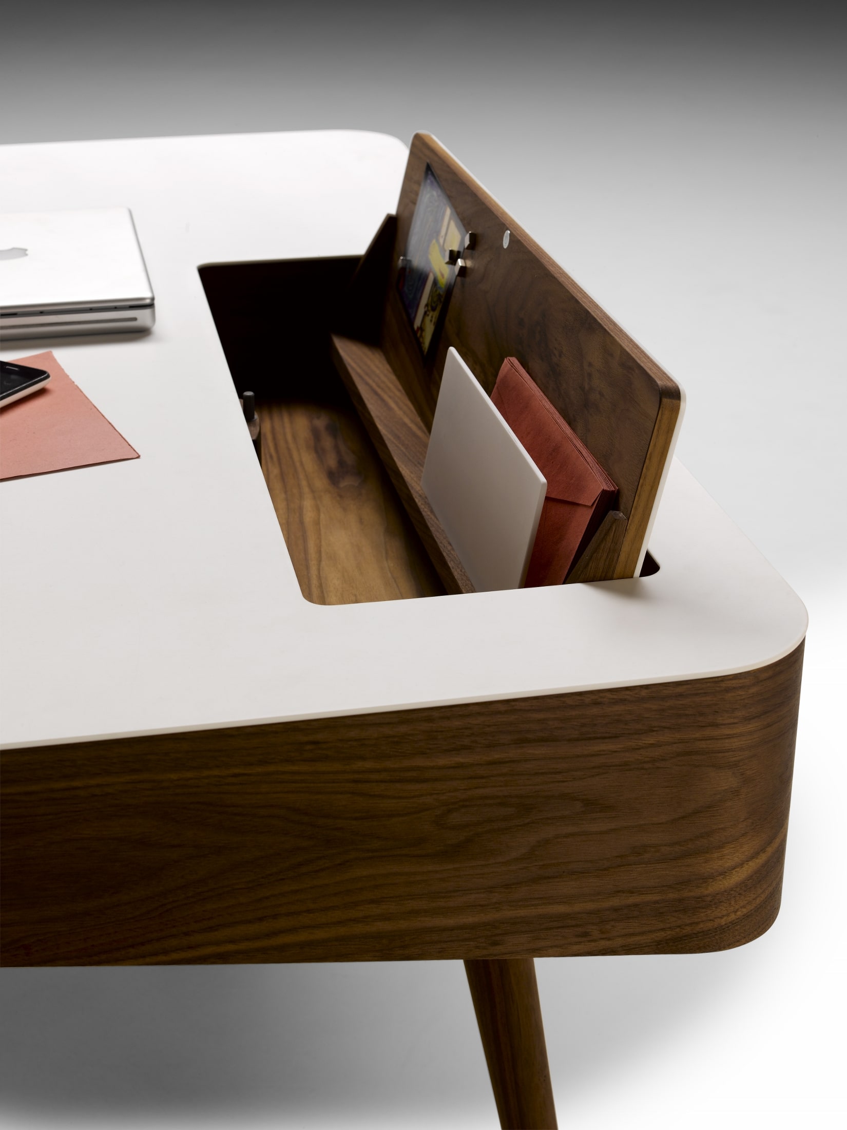 The AK1330 is a sophisticated home office desk featuring a luxurious Corian® surface and a hidden, lift-top compartment designed to keep the workspace impeccably organized and visually calm.