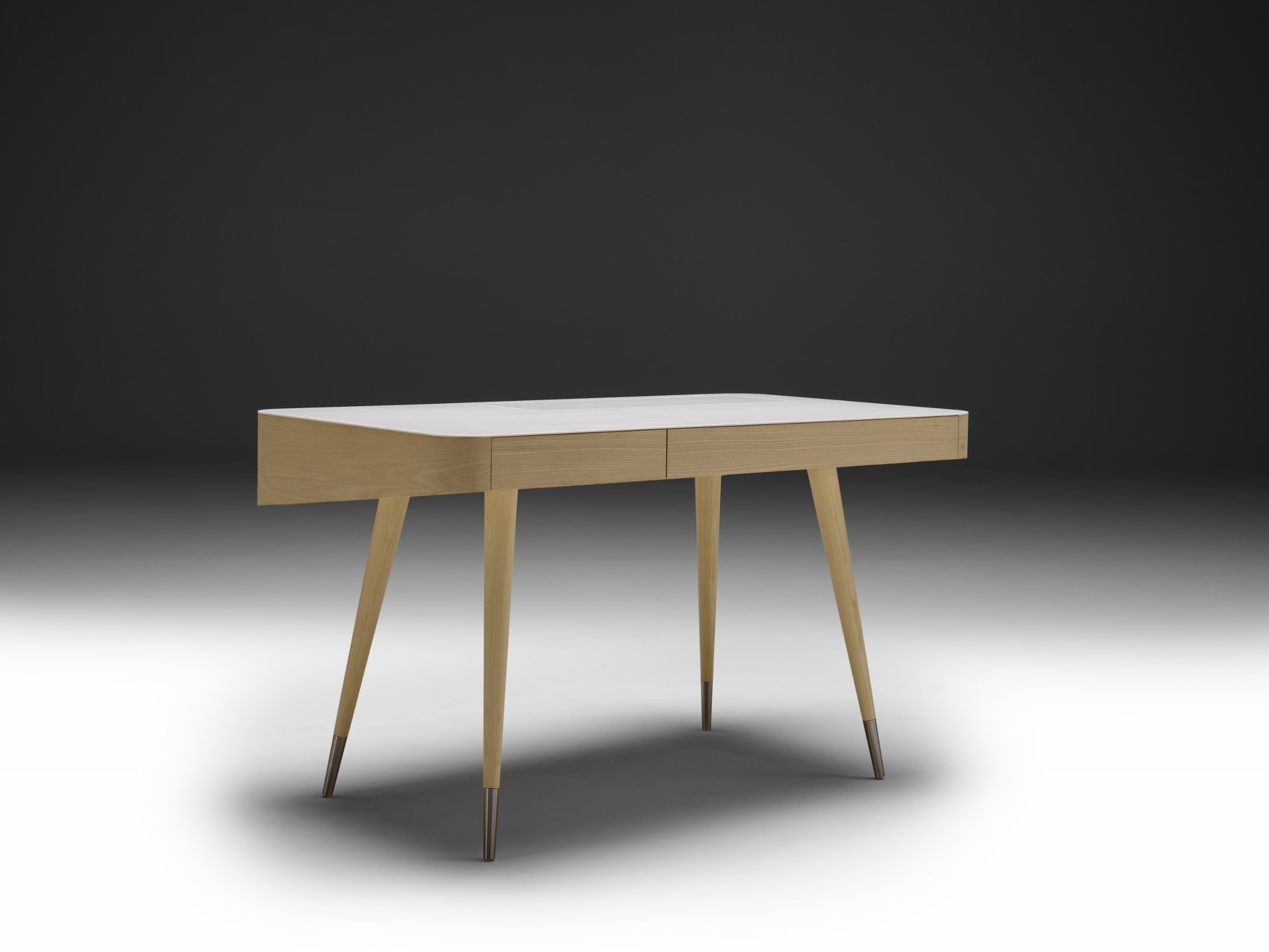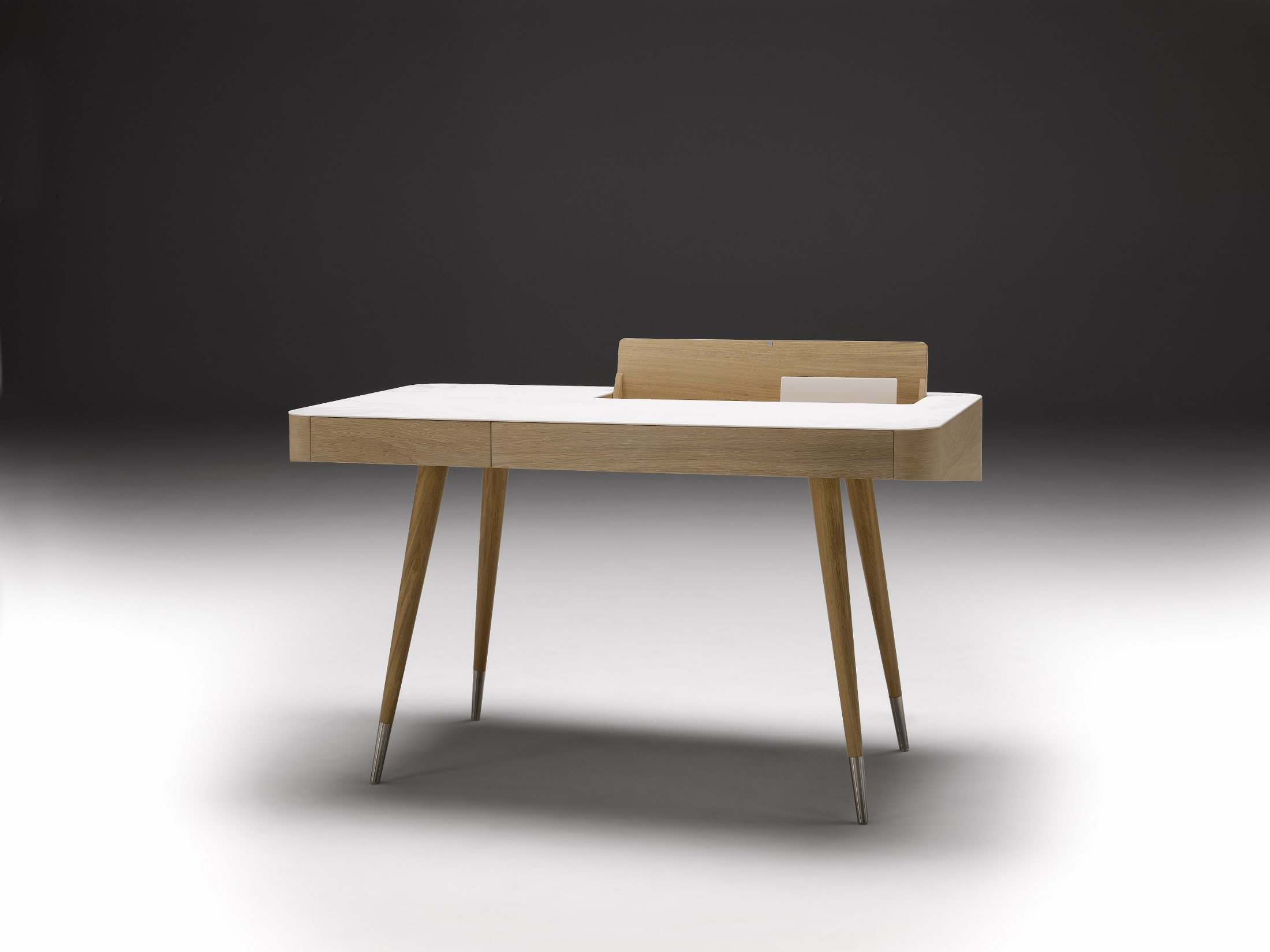 Wood Finishes: Oiled, Soaped, White Oil, Black Stained. Options: Corian top with hidden compartment, magnetic board, cable hole, two drawers. Point legs.