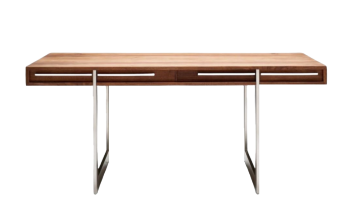 The AK1340 Desk by Naver Collection is a beautifully crafted Scandinavian workstation that brings warmth elegance and timeless simplicity into the home. Its smooth solid wood surface feels inviting to the touch while the slender stainless steel legs create a light floating impression that keeps the room feeling open and airy. The contrast between warm timber and cool steel gives the desk a refined modern character.