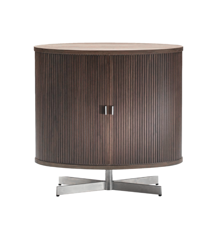 The AK 1365 is a sophisticated, compact bar cabinet featuring a sculptural X-shaped stainless steel base and signature tambour doors that glide open to reveal a dedicated interior for spirits and glassware.