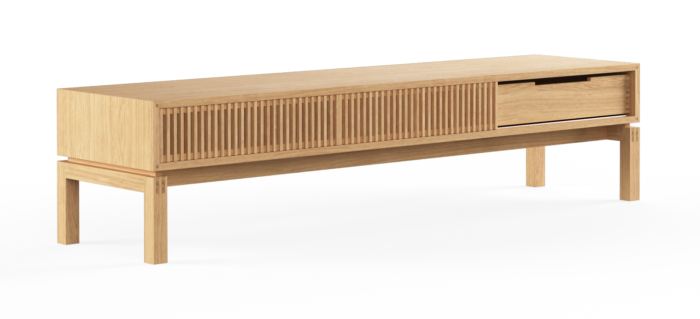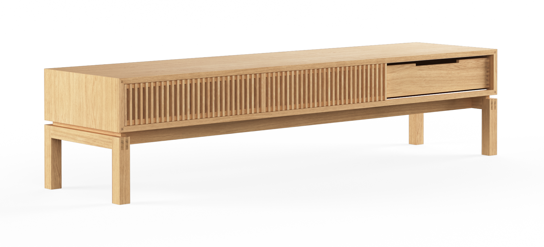 The AK 2020 TV Stand combines refined Scandinavian craftsmanship with practical, everyday functionality. Its iconic sliding doors are lined with acoustic fabric, allowing remote signals to pass through while neatly concealing media devices and cables. Set on a solid wood base, the unit positions the screen at an ideal viewing height, enhancing comfort for everyday watching as well as shared moments like movie nights or sports events. The freestanding design allows easy repositioning, offering flexibility as interiors evolve. Behind its clean exterior are precision-crafted details, including dovetail joints, delicate corner finishes, and a full-extension drawer that closes smoothly and silently. Repeated slatted doors add lightness, depth, and character to the design.
