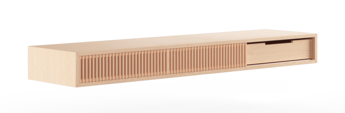 The AK 2025 TV Stand is a wall-mounted storage solution that combines refined craftsmanship with intelligent functionality. Its iconic sliding doors are lined with acoustic fabric, allowing remote signals to pass through while discreetly concealing digital devices and cables. Mounted on the wall, the unit creates a clean, floating expression that frees up floor space and enhances a minimalist interior—ideal for compact living areas. Behind its understated exterior lies a wealth of detail, including precision dovetail joints, delicate corner finishes, and full-extension drawers that close smoothly and silently. Repeated slatted doors add visual lightness, depth, and character to this elegantly engineered TV stand.