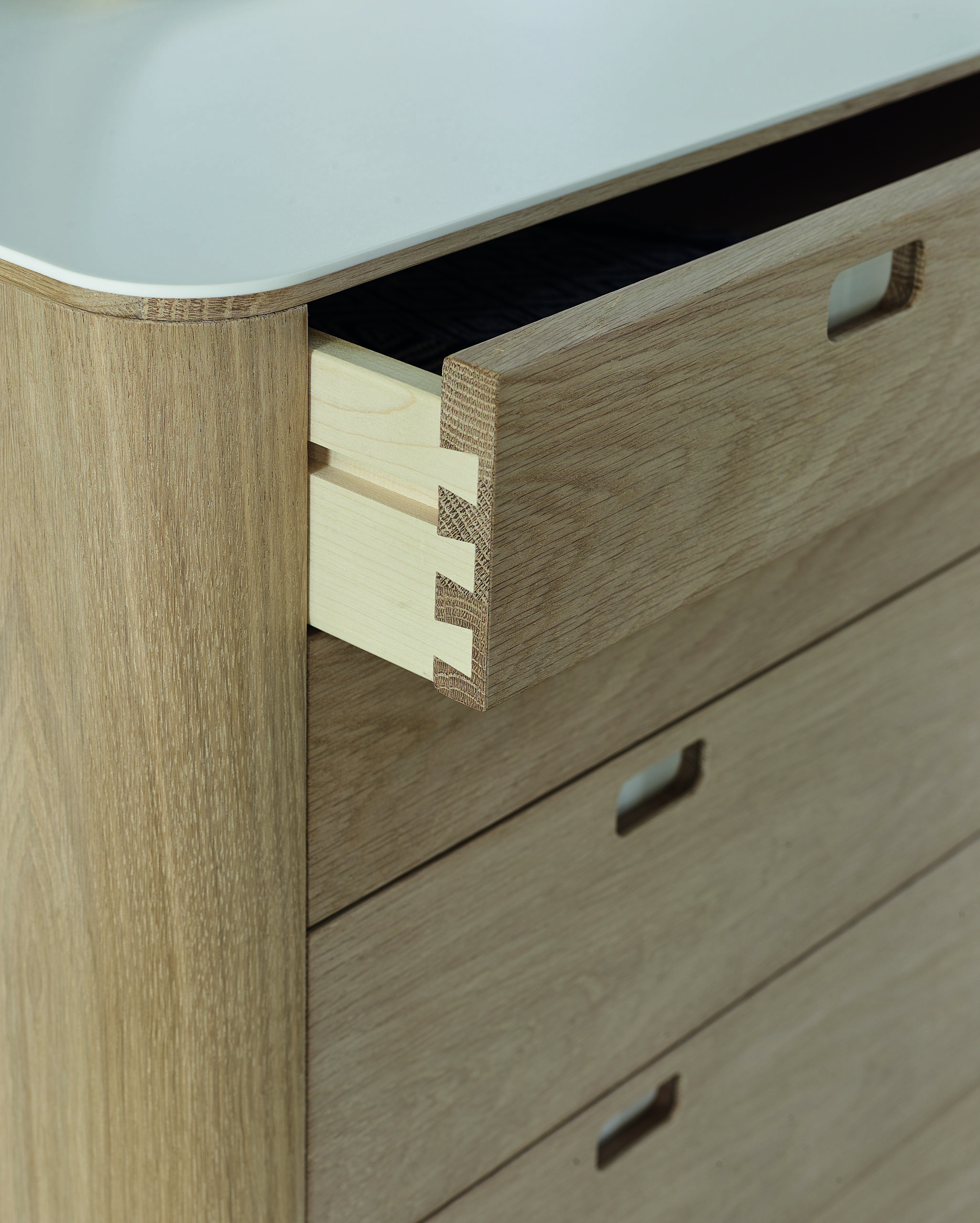 Designed by Nissen & Gehl for Naver Collection, the AK2420 Chest of Drawers is a refined example of contemporary Scandinavian craftsmanship. The design is defined by a clean white Corian® top and matching Corian® inserts in the handles, creating a crisp contrast against the warmth of solid maple sides. Precision dovetail joints reflect the high level of craftsmanship and ensure lasting durability. Offering generous storage within a calm, architectural form, the AK2420 works effortlessly in bedrooms, living spaces, or hallways. Its balanced proportions and timeless material palette allow it to integrate seamlessly into a wide range of interior styles.