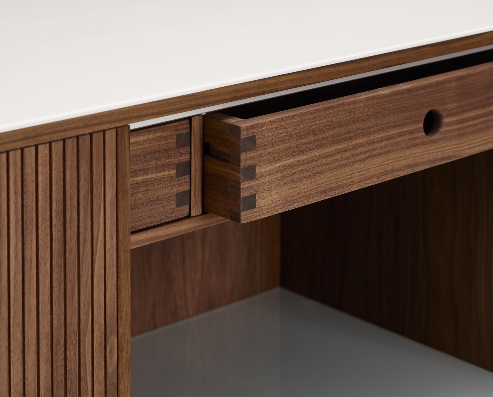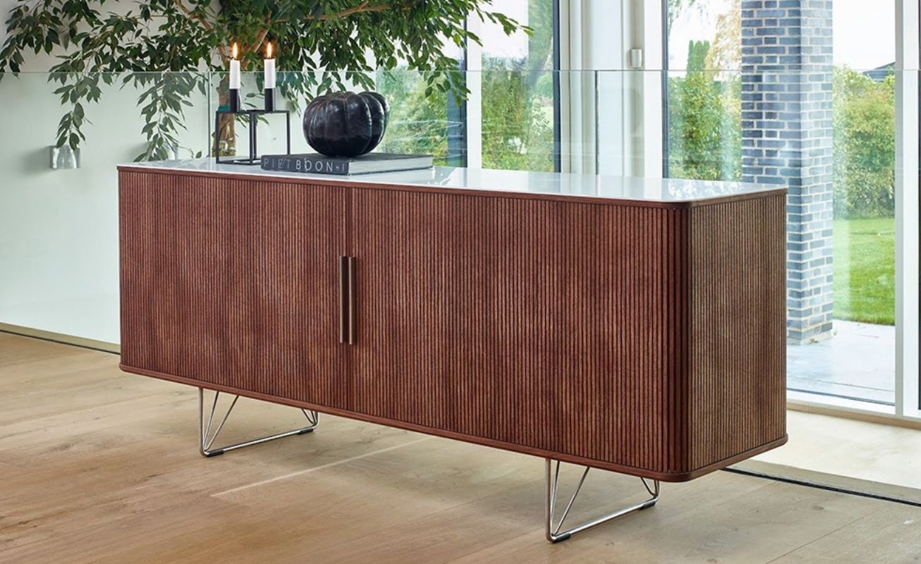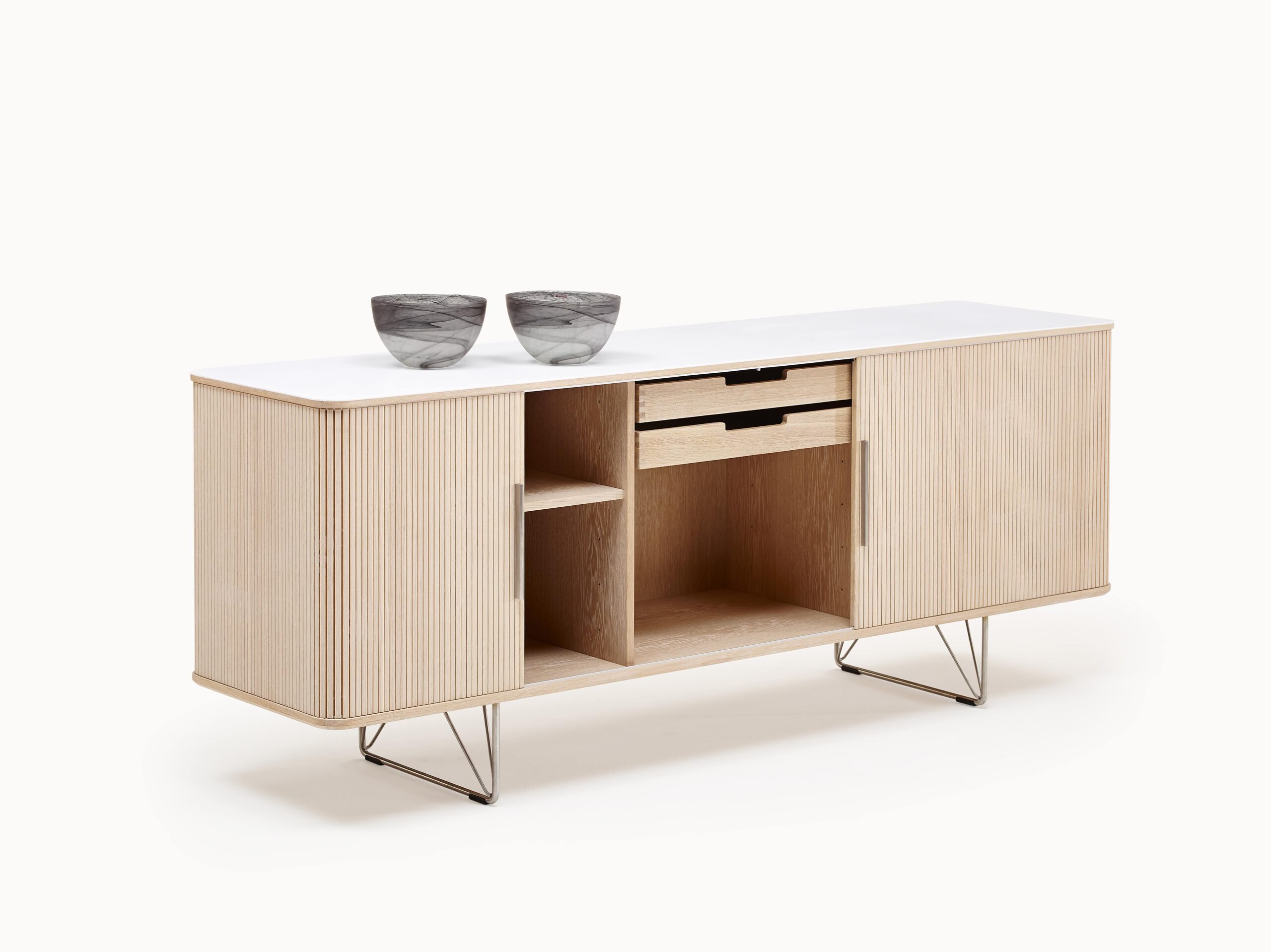 The AK 2730 is a sophisticated Scandinavian sideboard featuring a cool Corian top, a light-reflecting stainless steel base, and a thoughtfully organized interior with integrated wooden trays.