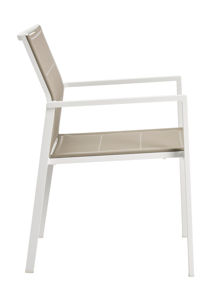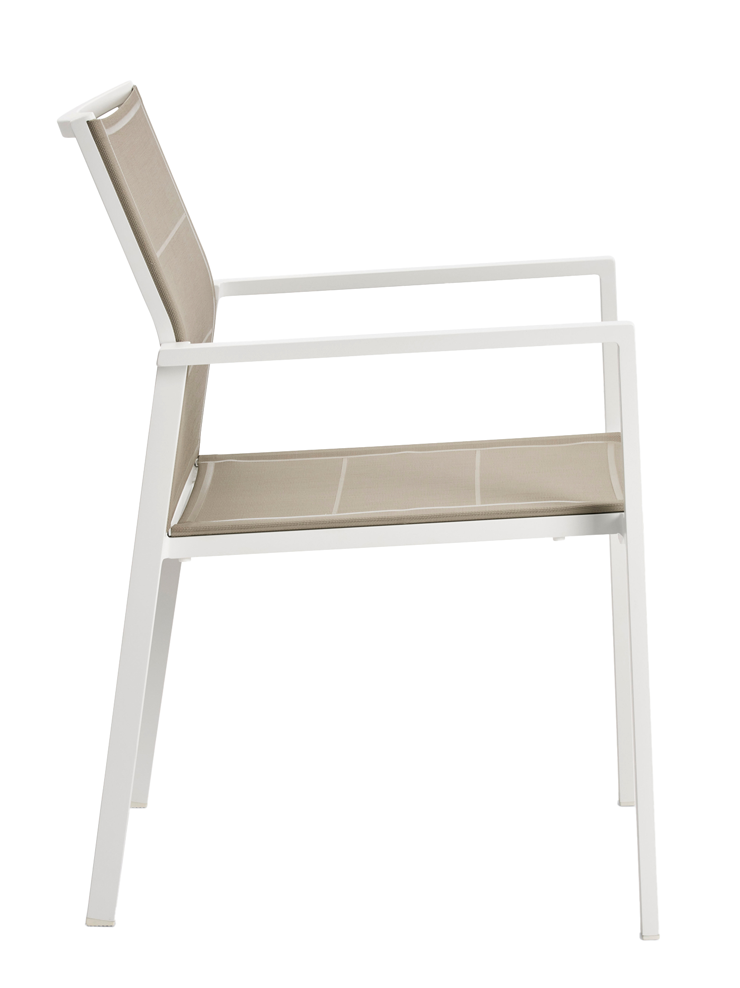 The Alexa Dining Armchair is a stackable, lightweight, strong aluminium outdoor dining chair with a cushion-free Textylene® sling seat.