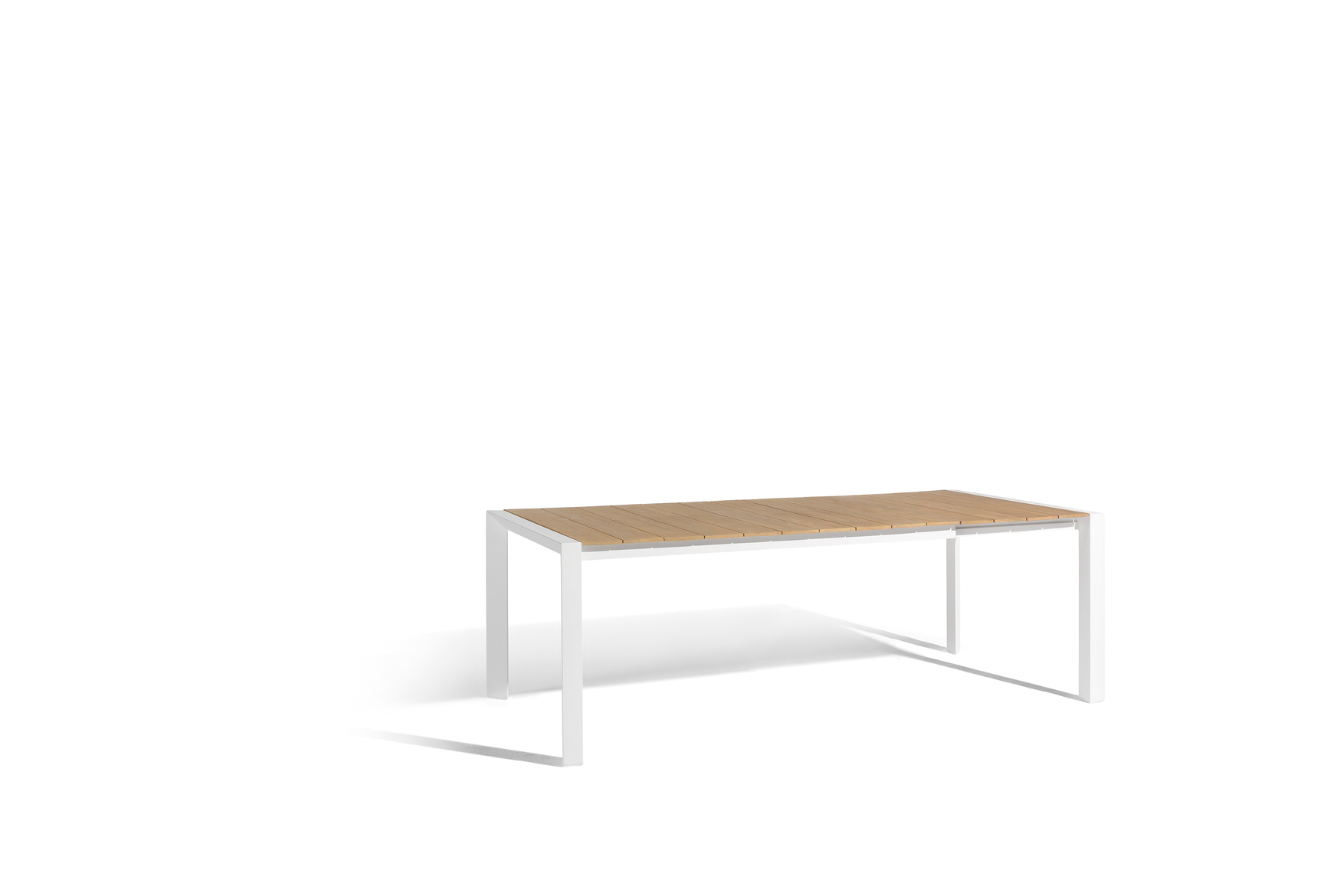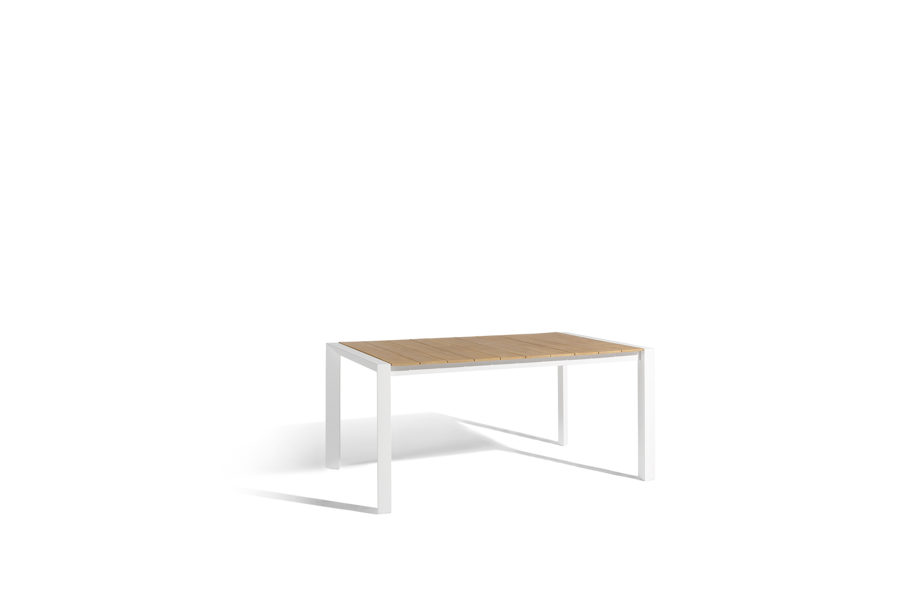Aluminium frame with Teak or Trespa® tabletop.Frame Colors: Lava, White. Tabletop Options: Natural Teak, Trespa® (various colors). Shape/Size: Extendable, Round, or Rectangular.