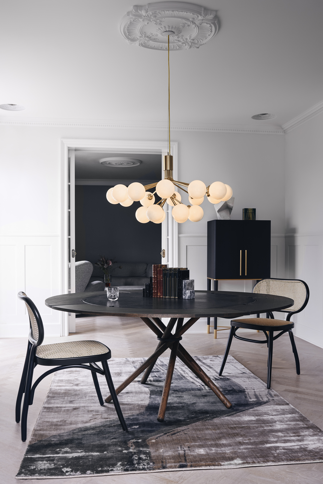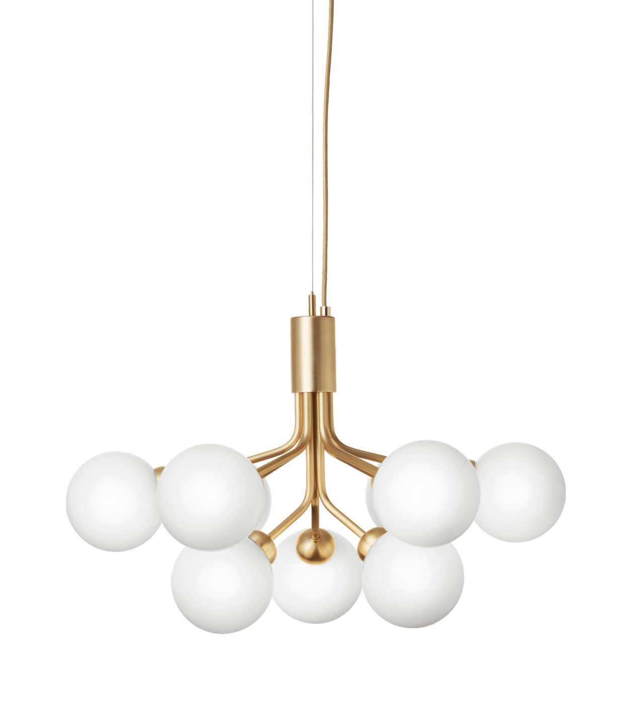 The Apiales Pendant Lamp is a contemporary Scandinavian take on a chandelier, with branching opal-glass globes like flower stems, offering a soft sculptural glow.