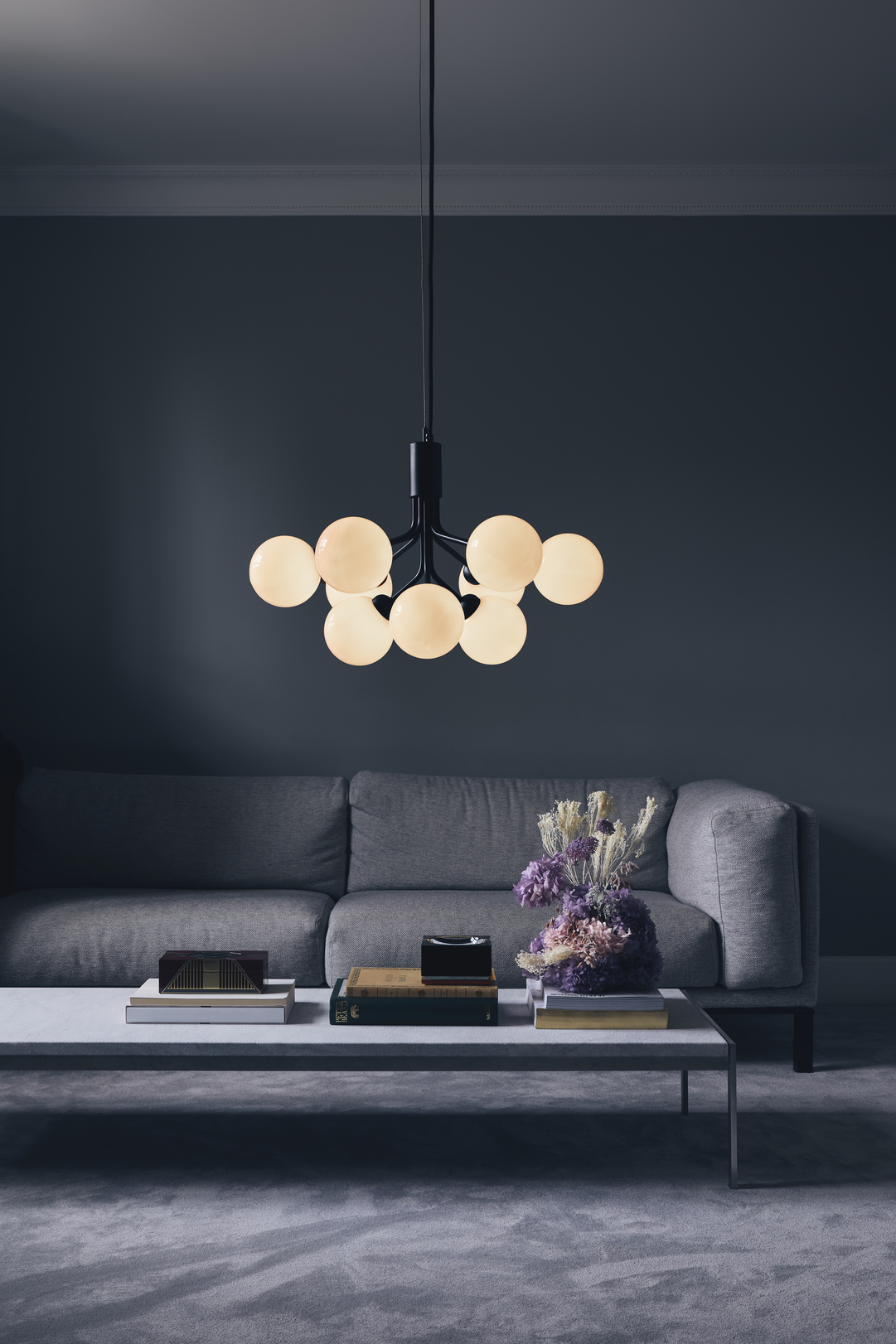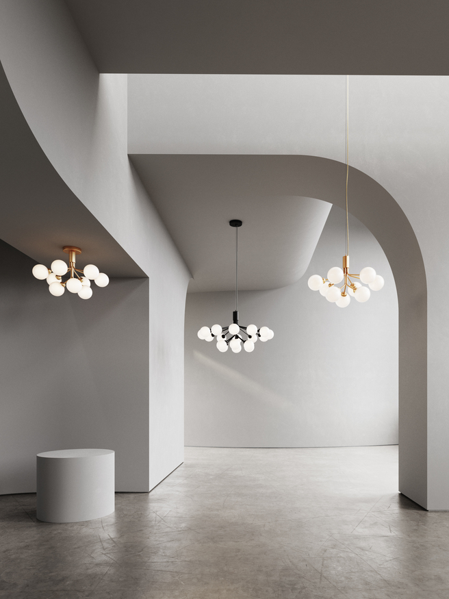 Each opal glass globe diffuses light gently giving the pendant a calm luminous presence that feels both sculptural and welcoming. The design is inspired by classic chandeliers but interpreted through a contemporary Scandinavian lens making it easy to pair with modern interiors. Apiales also works beautifully above kitchen islands creating strong ambient lighting and a stunning visual focal point. With its refined materials and floral silhouette, the Apiales Pendant Lamp brings timeless charm to any home.