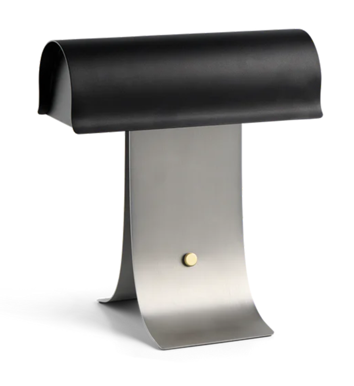 Inspired by the utilitarian lighting found in historic archives and libraries, this lamp features a tilting shade that allows for precise light direction. It combines industrial durability with curved, modern edges to create a professional yet welcoming desk light.