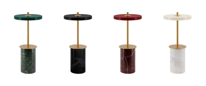 The Asteria Move Mini is a compact, portable lamp with a solid marble base, delivering warm, mood-setting light indoors or outdoors