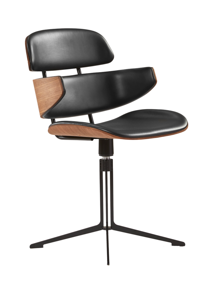 The slim profile and graphic curves give the chair a light floating presence. Its smooth swivel base lifts the seat elegantly from the floor allowing you to turn effortlessly while maintaining a calm visual balance in the room. Luxuriously upholstered elements add tactile comfort and make the chair inviting for long evenings.
