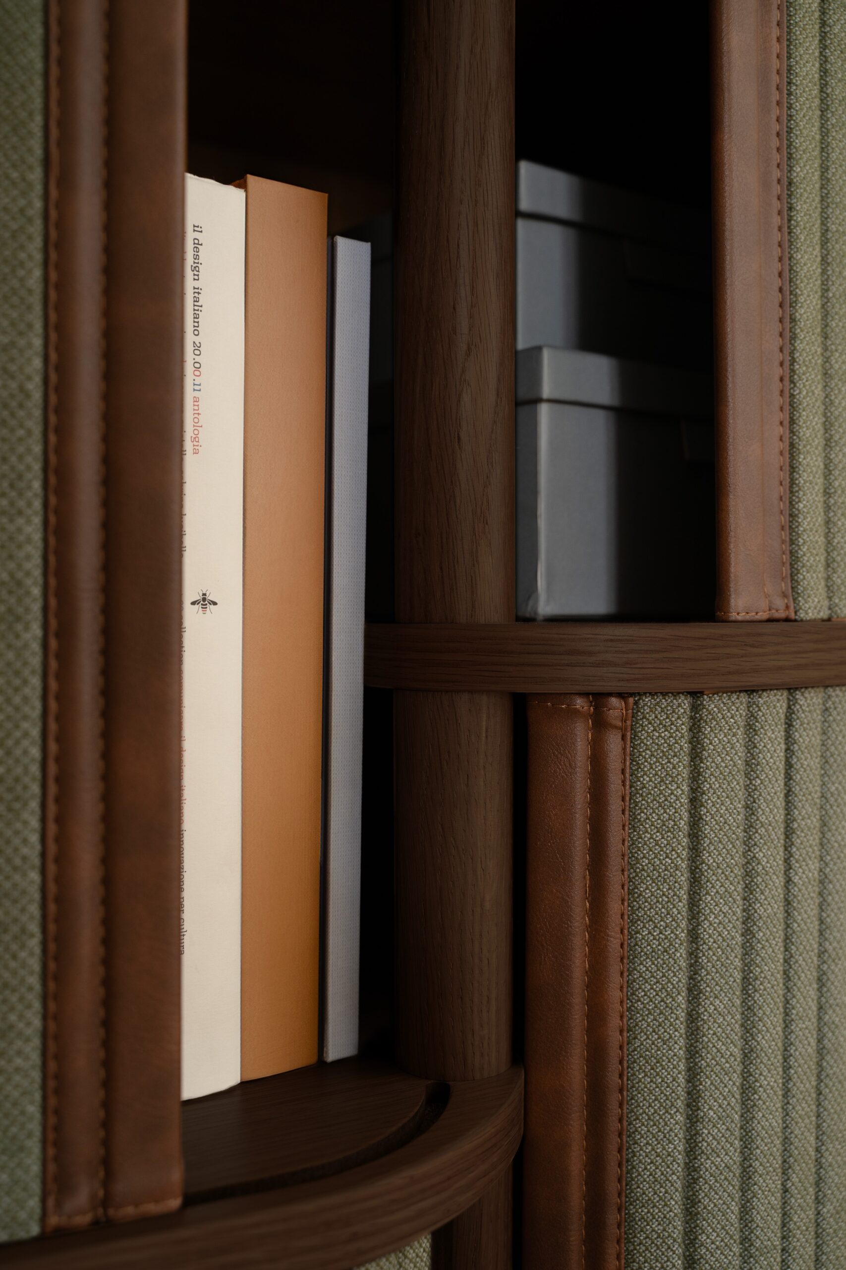 The Audacious Highboard is a warm, modern-Scandinavian storage piece with smooth sliding tambour doors, and a roomy two-shelf interior.