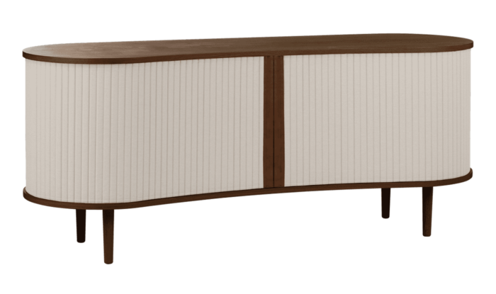 A storage unit with soft, organic curves and sustainable textile tambour doors.