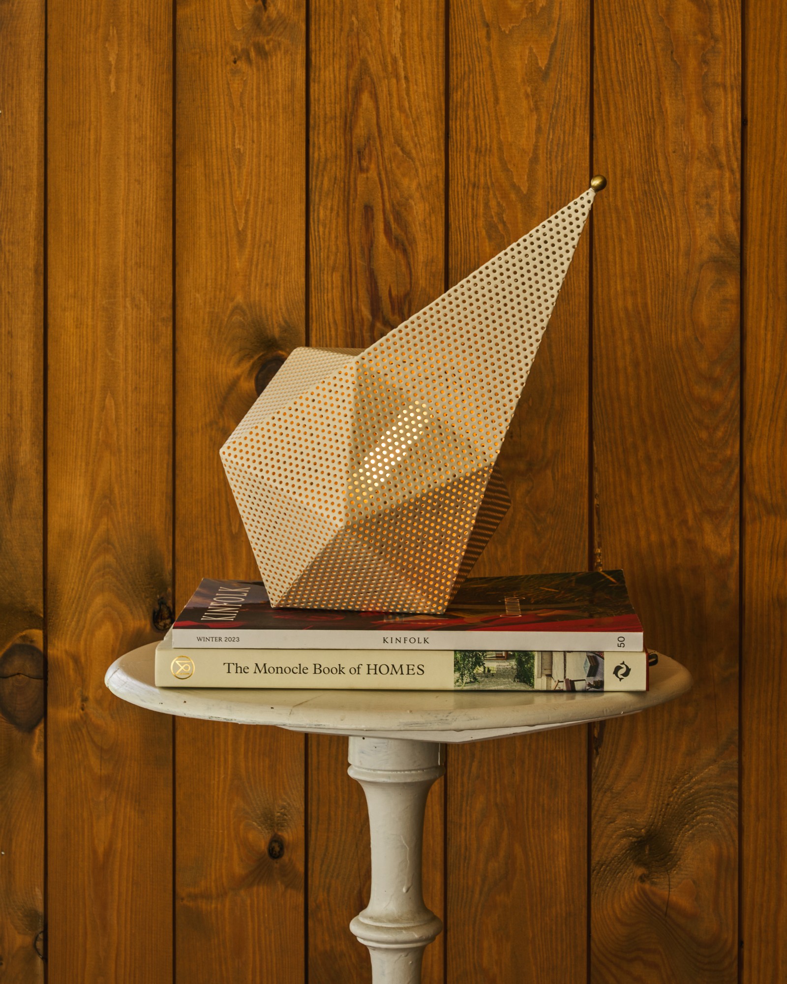 Originally designed in 1954, the Bagdad Lamp is a brilliantly offbeat showcase of Mathieu Matégot’s material affinity with perforated metal, or ‘rigitulle.’ Reimagined as a portable lamp, its multifaceted, cubist construction with a comet-like tail is inspired by Middle Eastern lanterns, bringing a sculptural, playful uniqueness to indoor and outdoor settings.