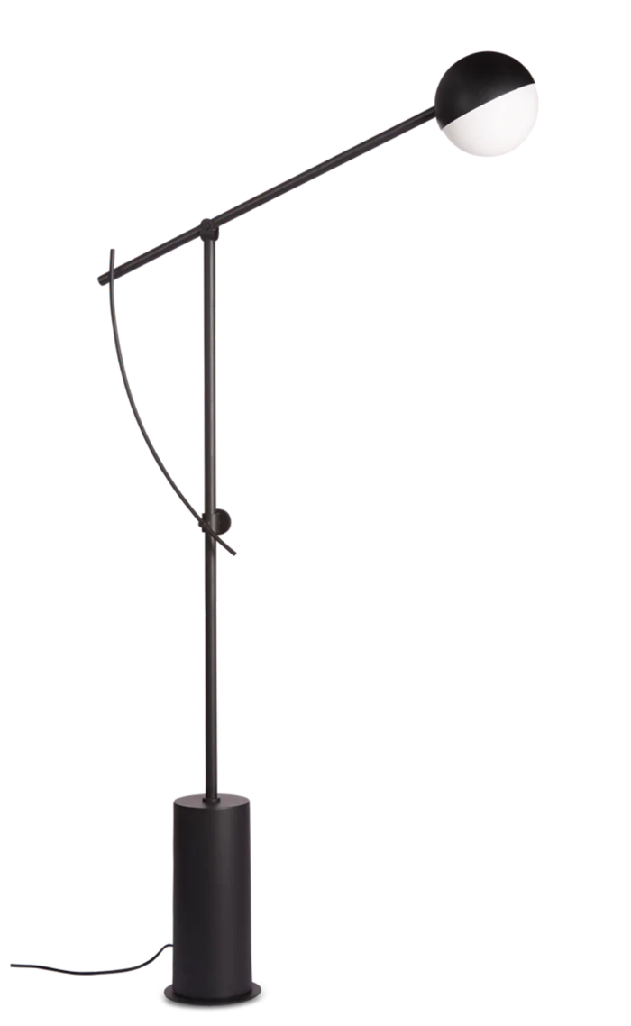 A bold architectural lamp that uses a heavy counterweight to balance a long, adjustable arm. It allows the user to swivel and tilt the light source across a wide radius, making it a highly functional piece for large lounges or reading areas.