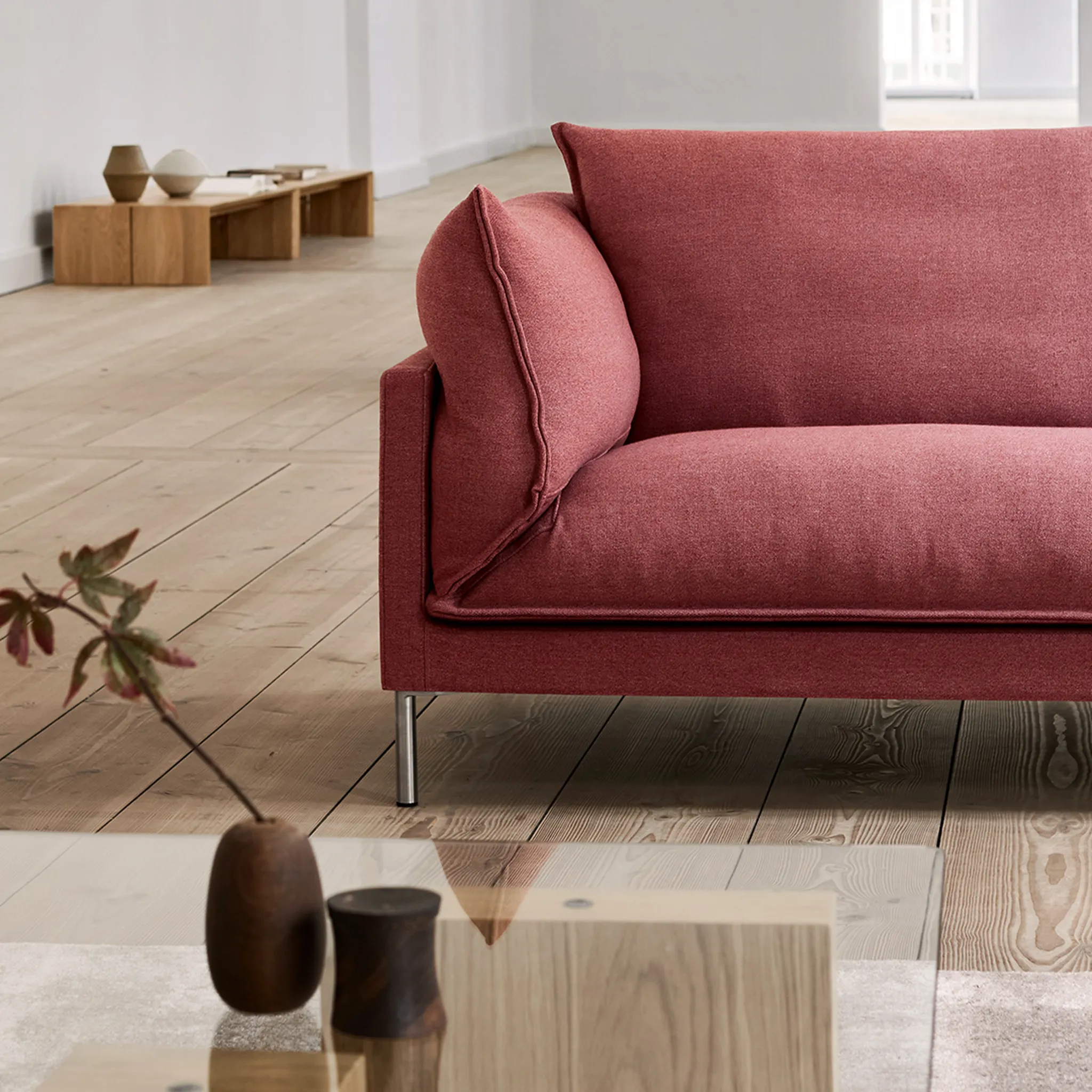The Butterfly Sofa is a beautiful Danish-Japanese collaboration that masters the balance between the formal and the informal. From the back, it appears slim and minimalistic, while the front reveals a deeply soft, down-filled interior with visible stitching that lends a cozy, bohemian touch. This duality, combined with a thin body and narrow legs, creates a visually light sofa that is both stringent in form and profoundly inviting in comfort.