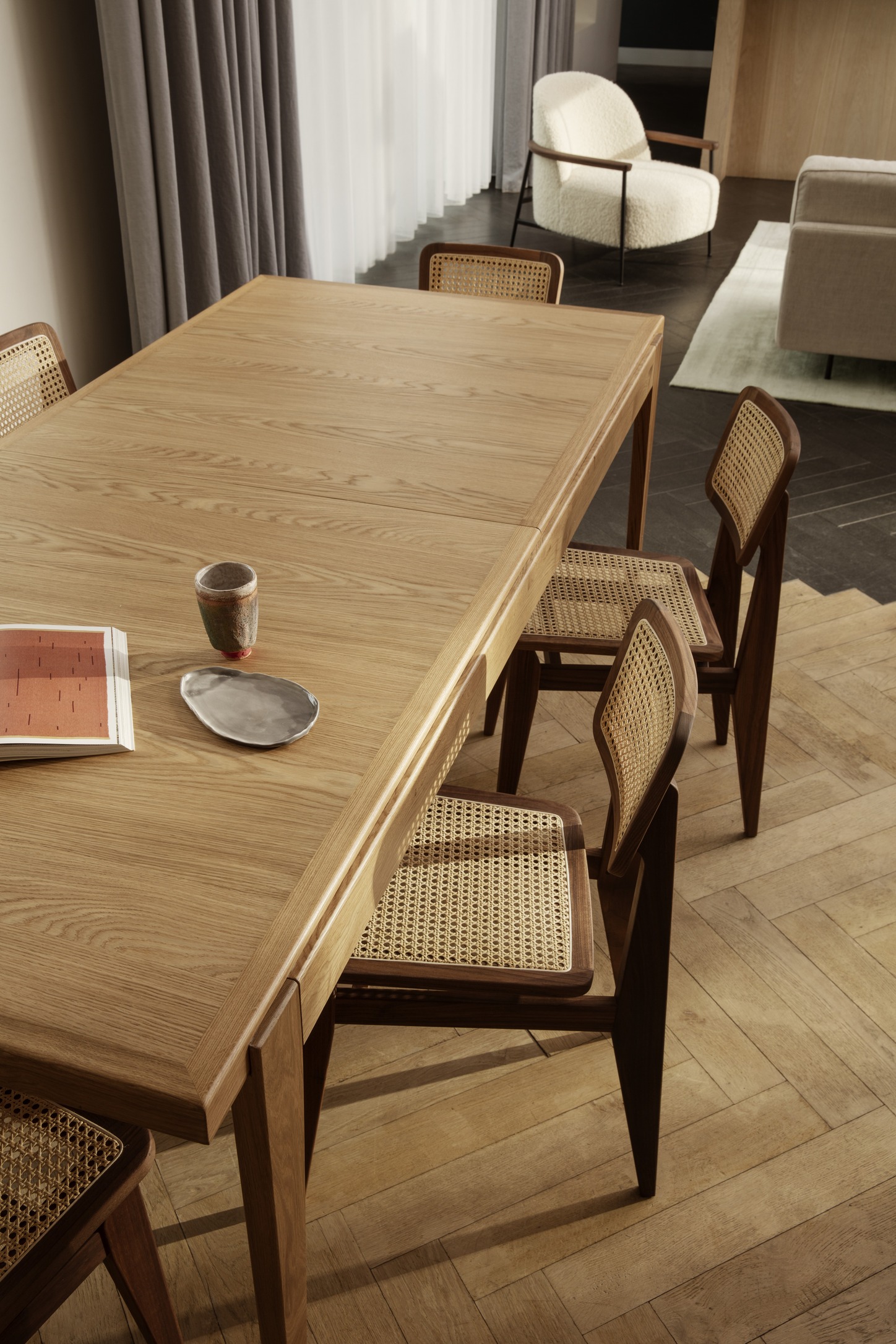 Originating in 1947, Marcel Gascoin’s C-Chair is a timeless classic created to fit smaller post-war homes where space was valuable. It features a thoughtful design that combines simplicity and function, highlighted by the contrast between its robust legs and the lightness of the woven seat and back.