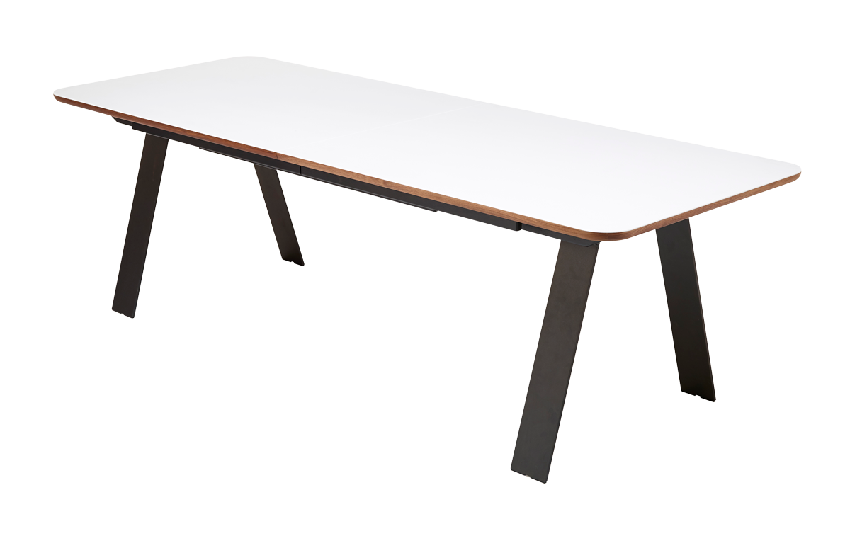 Wood Finishes: Oiled, Soaped, White Oiled, Lacquered. Top: Solid Wood, or Corian (white) top with solid wood edge. Options: Built-in Butterfly extension leaf (in matching wood/Corian). Legs: Black Powder Coated Steel or Black Stained Wooden Legs.