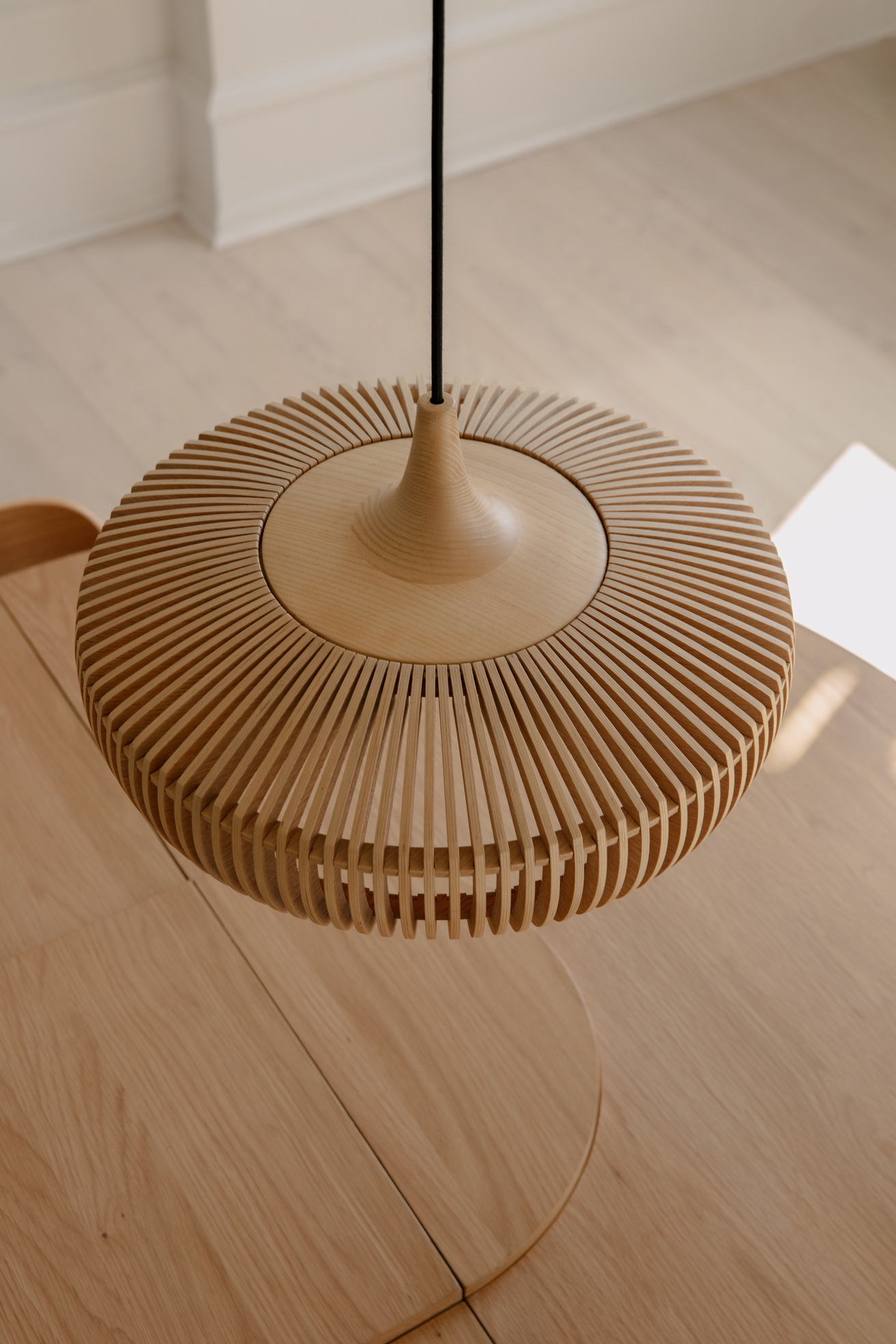 A sculptural wooden lampshade crafted to create a playful interplay of light.
