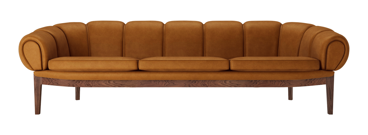 The GUBI Croissant Sofa is defined by a bold, arched silhouette and meticulous hand-stitching that emphasizes its layered look, offering a confident alternative to traditional, boxy seating.