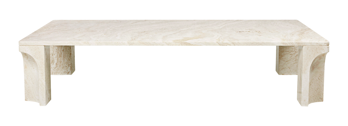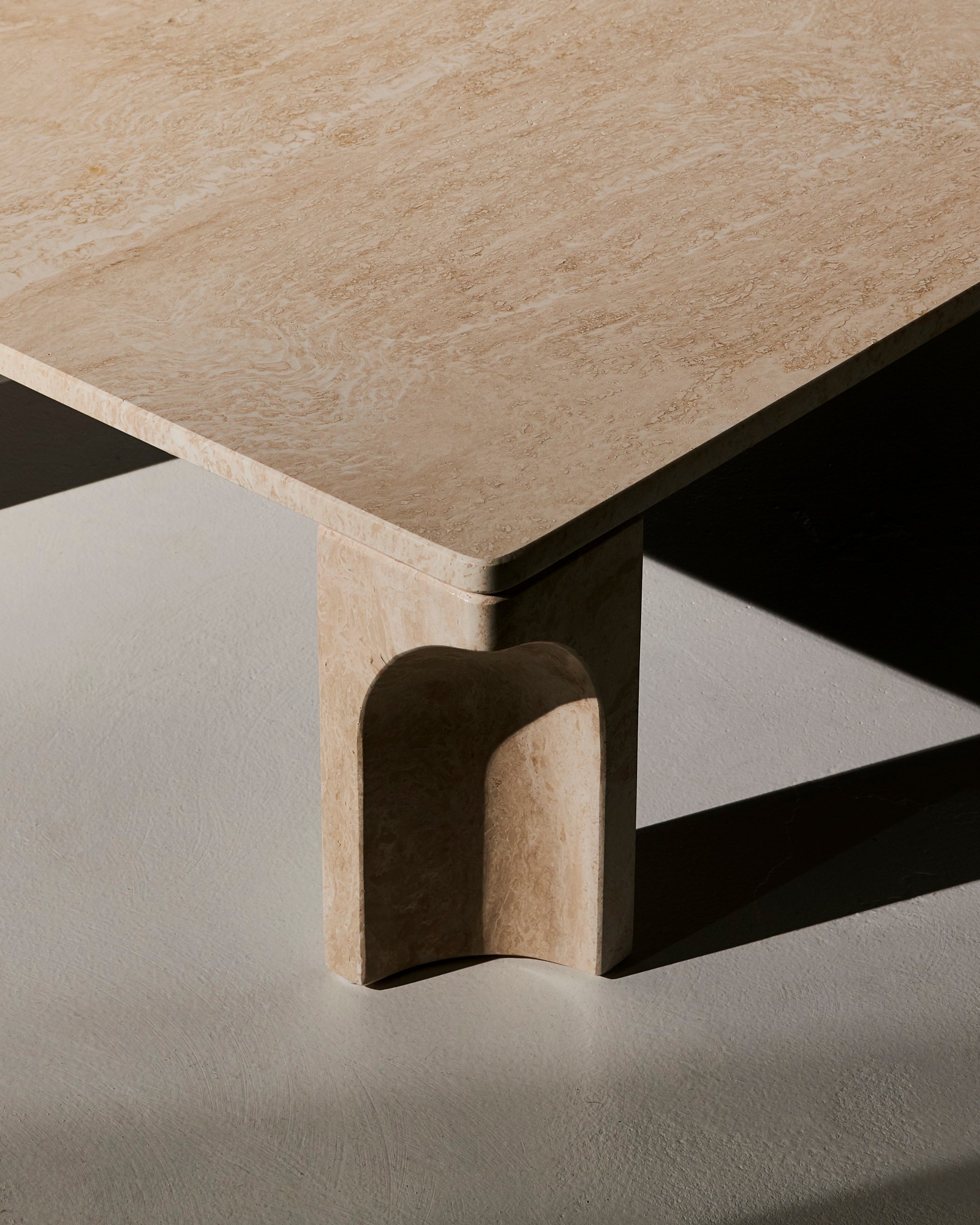 A sculptural table named after the Doric order of ancient Greek architecture, this monolithic piece is defined by its simple, functional elegance. The legs feature an inward curve reminiscent of column fluting, adding a sophisticated lightness to the solid, timeless travertine block.