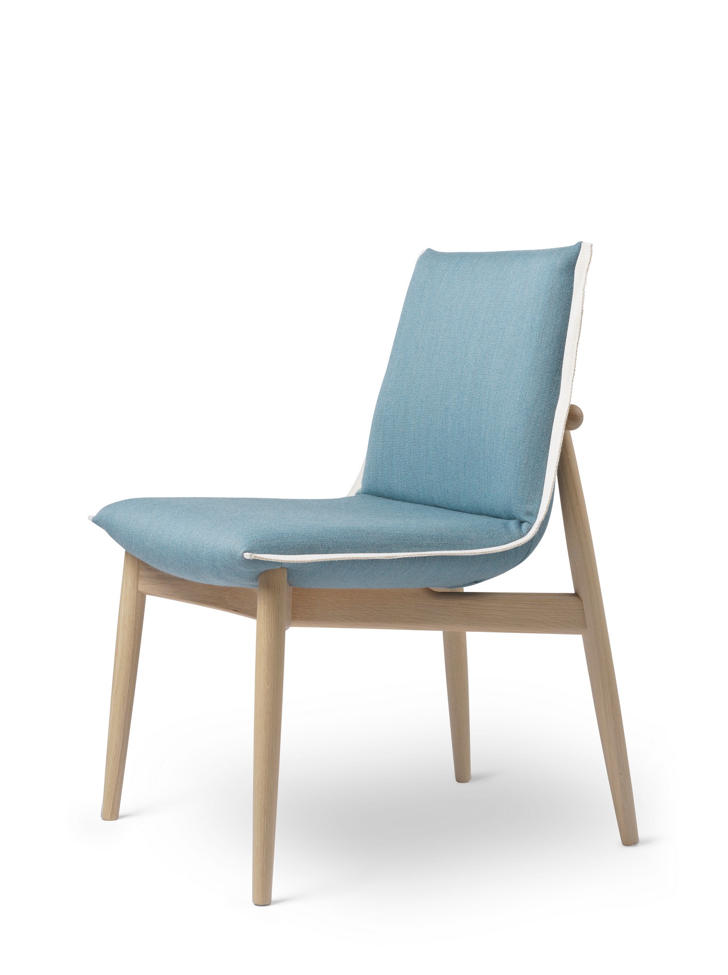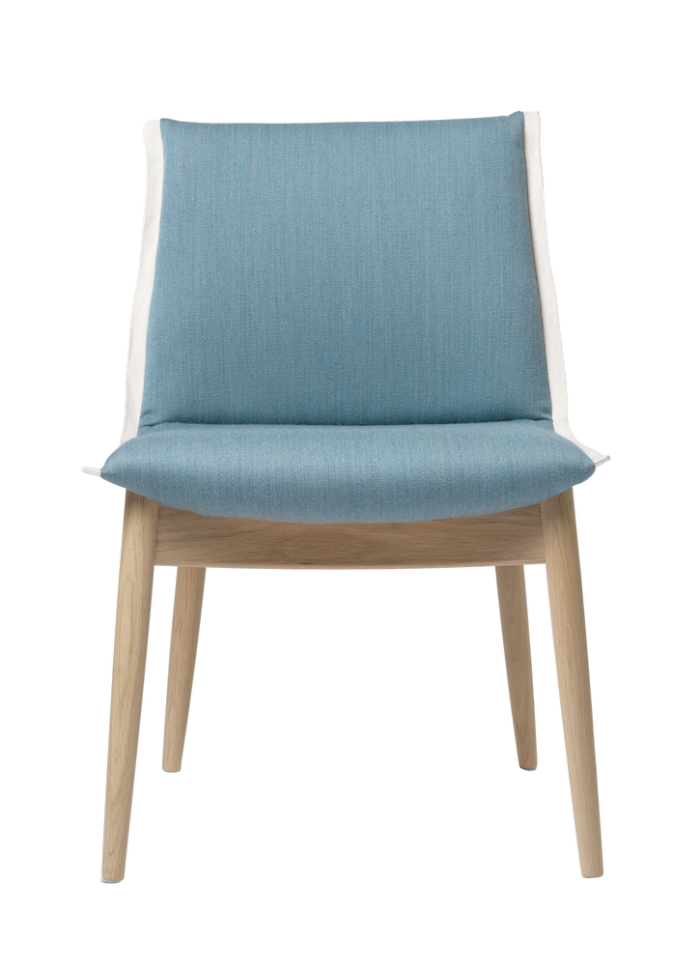 Solid Hardwood Frame, Upholstered Seat and BackWood: Oak or Walnut. Finishes: Oil, White Oil, Soap, Lacquer, or Black Paint/Lacquer. Upholstery: Upholstered in various Fabric or Leather grades. Details: Contrasting edging strip/cord available in colors like Black, White, Natural, Brown, or Blue. Options: This version is without armrests. The E005 Embrace Chair (with armrests) is also available.