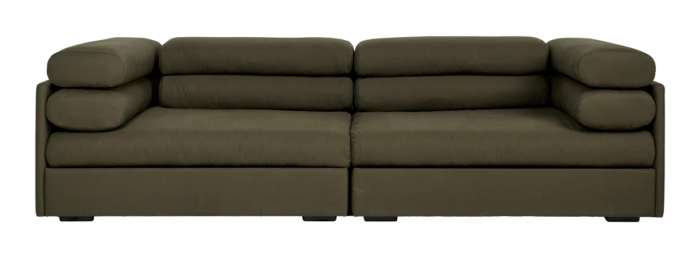 A modular sofa expressing an inviting softness with an architectural structure. The design allows for multiple configurations, featuring interchangeable, generously sized cushions for adaptable comfort and a highly flexible, contemporary aesthetic.