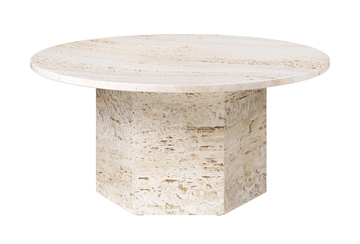 The GUBI Epic Coffee Table combines two primary geometric forms—a hexagonal base and a circular top—to create a structural focal point that highlights the natural, unrepeatable beauty of stone.
