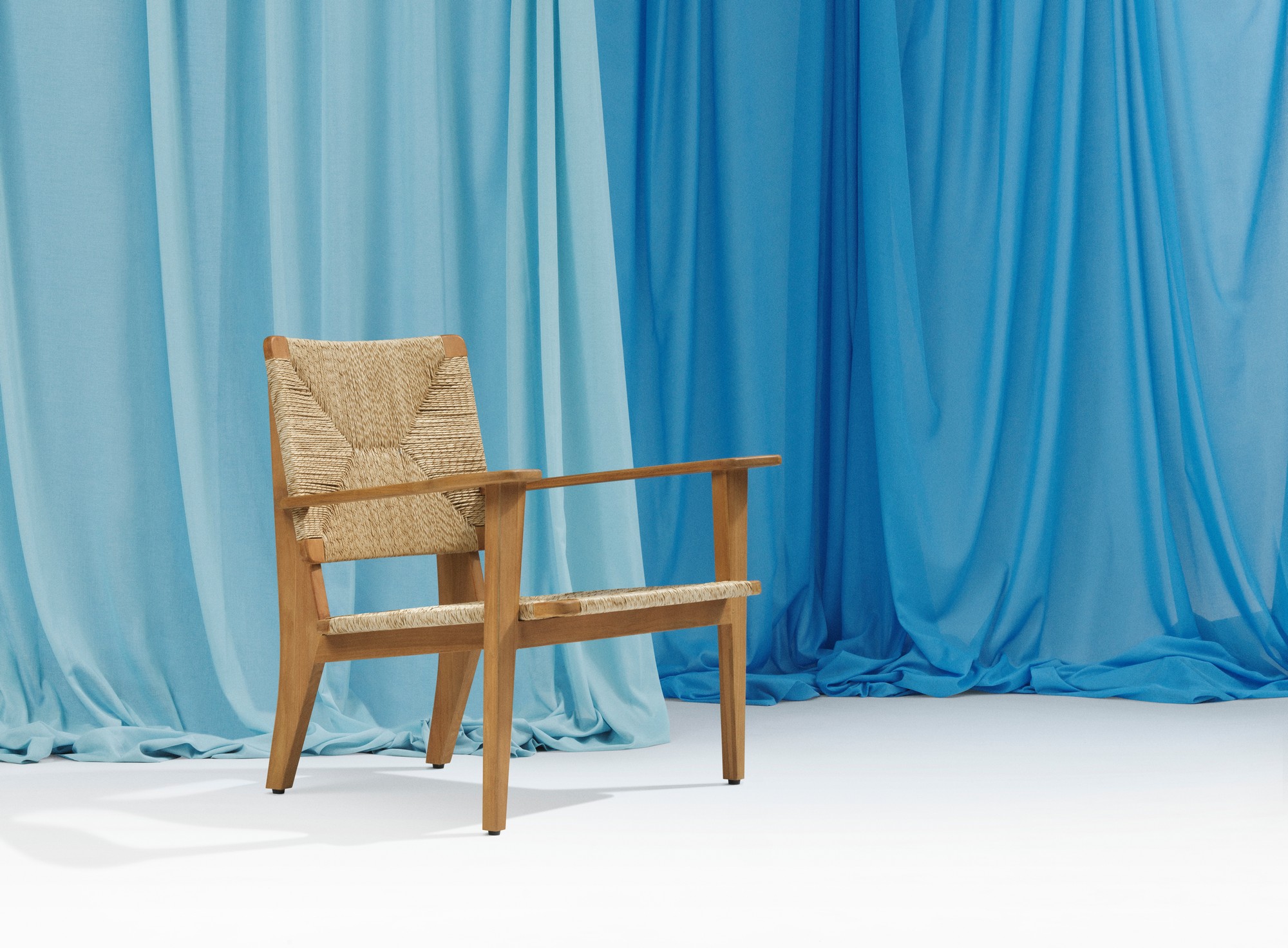 A comfortable outdoor lounge chair, reissued based on Gascoin’s original drawings. It places high-quality, durable teak and weather-resistant woven fiber at its heart, creating a timeless, characterful piece for the outdoor living space, perfect for soaking up the sun.