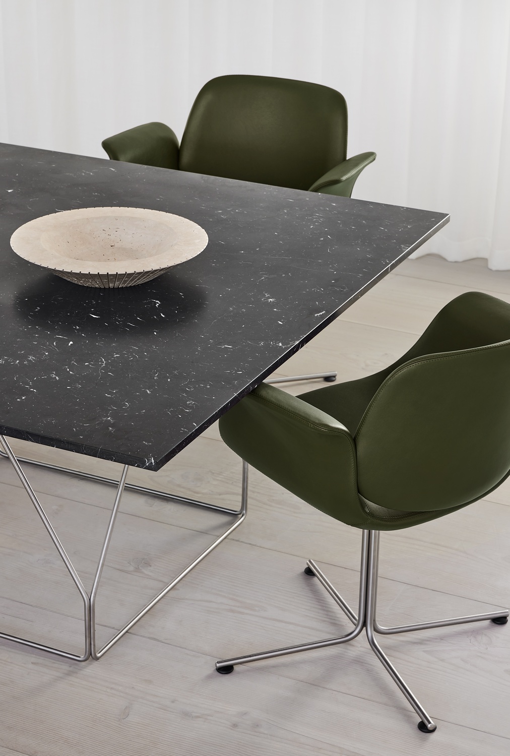 The Flamingo Dining Chair is a sculpturally light dining chair with a slim steel “floating” frame, a softly curved upholstered seat, and wing-like arms.