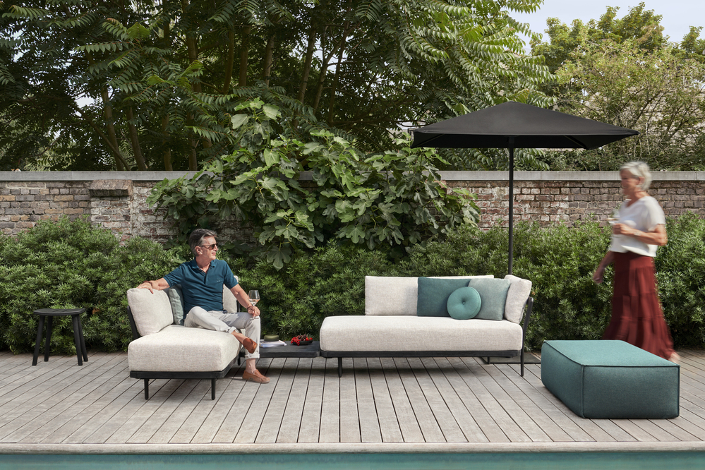 The cushion set feels soft yet supportive with a subtle texture that stays cool to the touch even on warm afternoons. Designed for modular outdoor seating, the Flows collection integrates smoothly with matching elements so you can build flexible arrangements to fit patios, balconies or gardens. However this particular piece is a stand out all on its own with open ends allowing you to seat more people with ease.