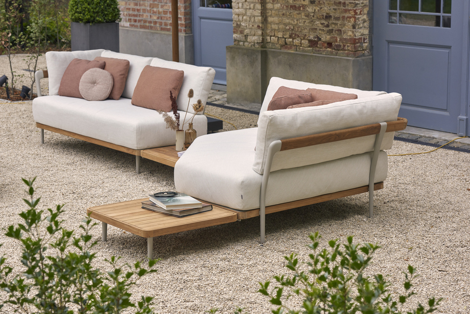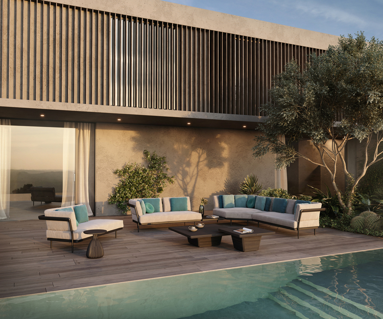 The Manutti Flows Lounge brings refined elegance to outdoor living with its blend of a light aluminium frame and warm teak accents for a timeless modern garden sofa. Its spacious corner design and deep seat invite relaxed lounging and effortless comfort under the Singapore sky.