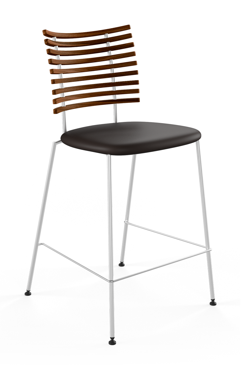 The seat is upholstered in soft tactile leather that adds warmth and luxurious comfort for long relaxed conversations. Crafted in oak, walnut, elm, ash, black stained wood, or the new Ocean Gray finish the Tiger Barstool introduces rich natural texture and timeless character into any interior.