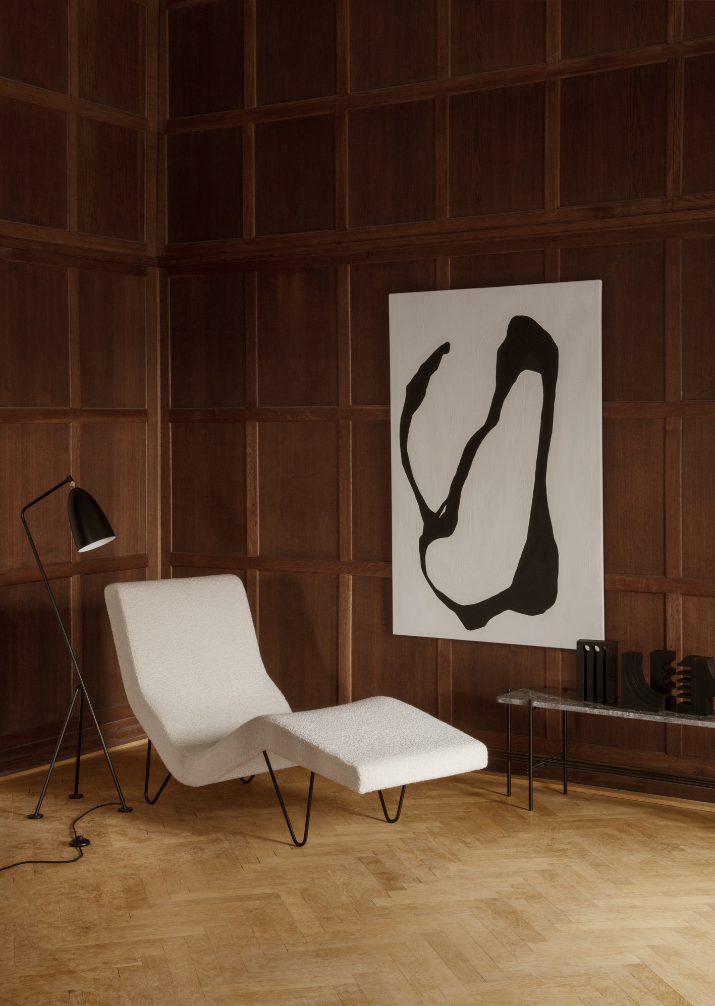 The GMG Chaise Longue is a masterpiece of playful elegance that perfectly mirrors the body’s natural curves for ultimate relaxation, featuring a streamlined form that appears to float atop Greta M. Grossman’s signature slender legs