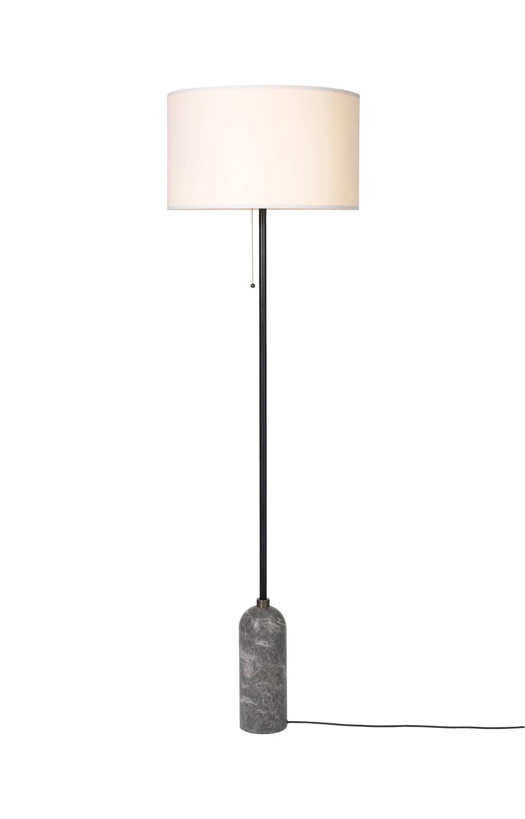 The Gravity Collection is defined by the contrast between light and heavy elements, blending the robust gravity of the heavy cylindrical marble base with the light, ethereal quality of the large textile shade. It provides a beautifully soft ambient illumination.