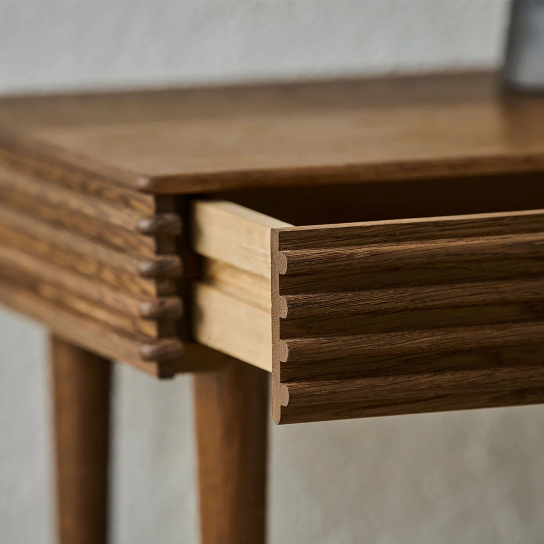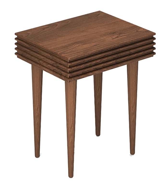 The Groove Night Table is a compact solid wood design defined by precision grooves and discreet functionality.