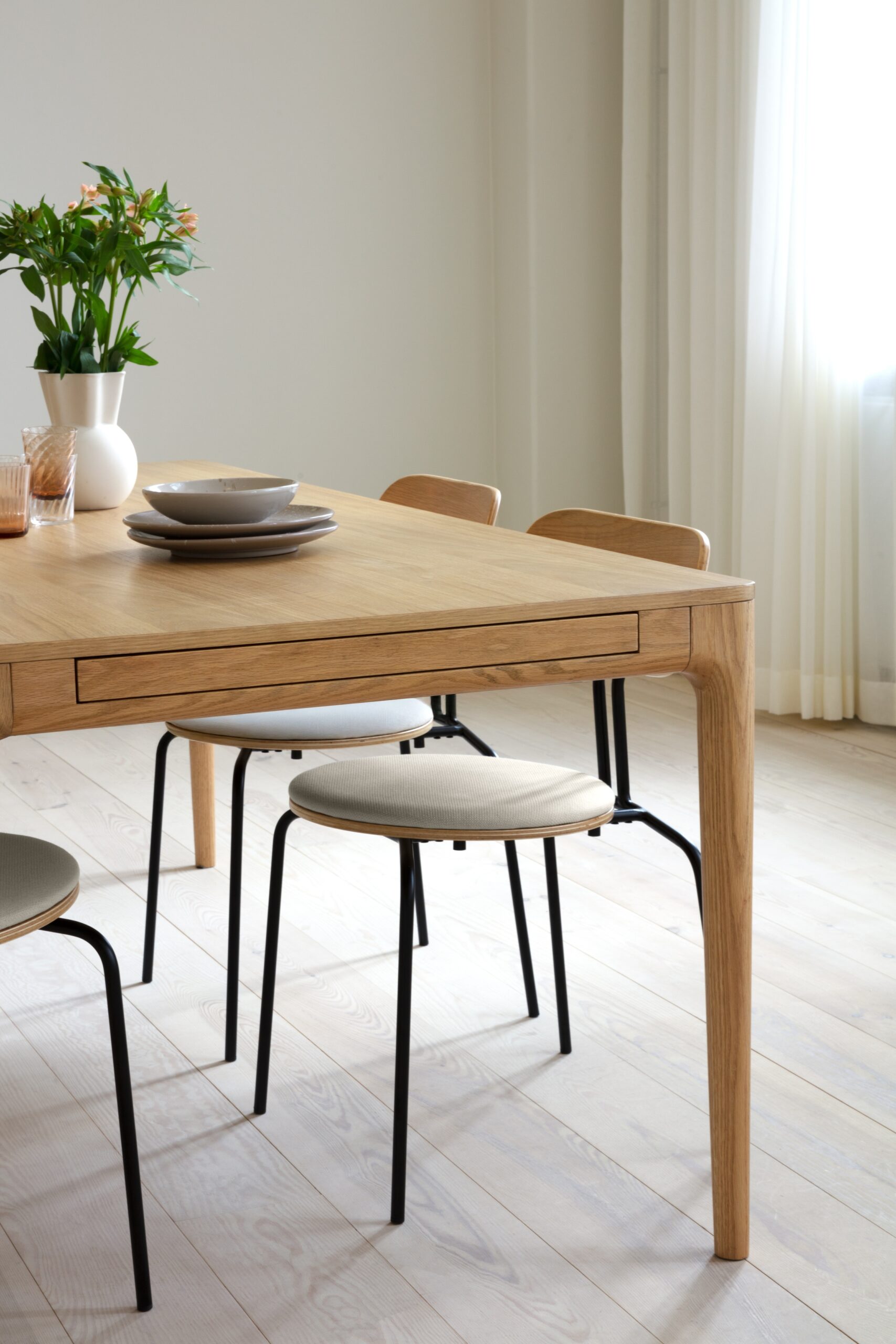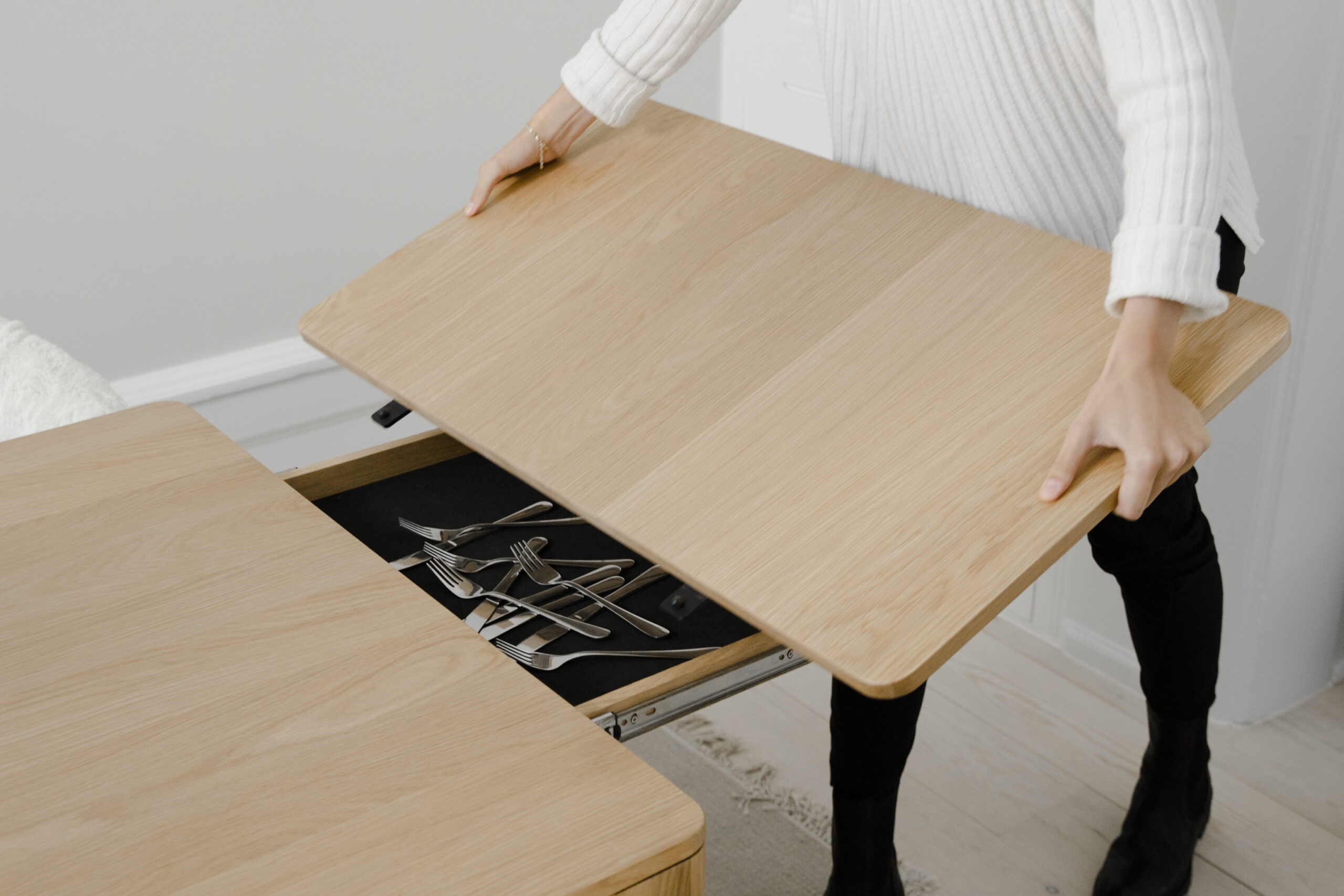 The Heart’n’Soul Dining Table is a warm, clean-lined Scandinavian extendable table, with two fabric-lined end drawers that store the extension leaves (and small essentials) for calm, clutter-free flexibility.