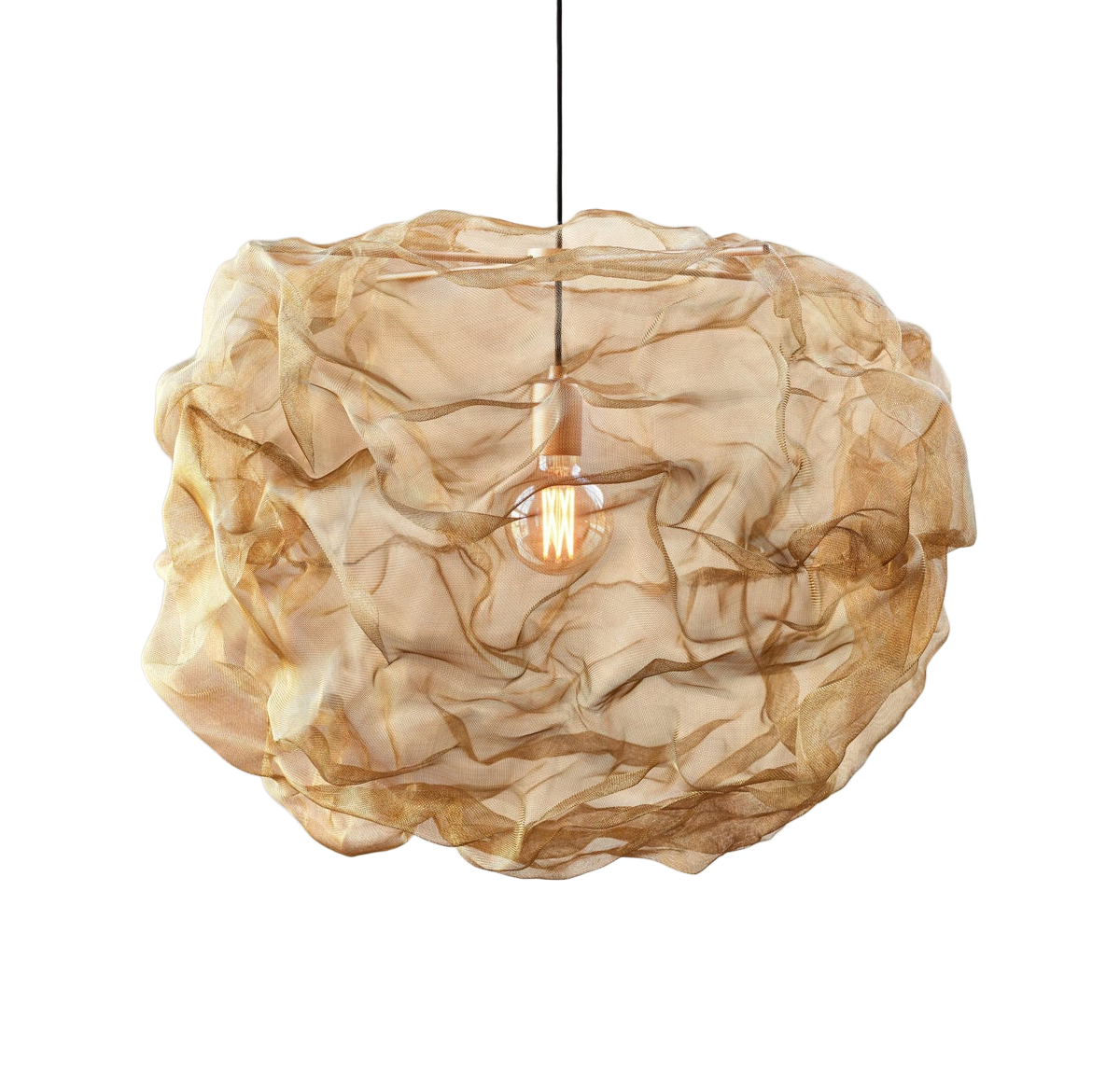 The Heat Pendant Lamp brings a dramatic blend of art and illumination to your home with a form that shifts beautifully between fiery and serene. Created by mesh artist Johanna Forsberg, this pendant begins as shimmering brass mesh that is sculpted into an airy cloud like shape. Switch on the light and it transforms into a warm glowing orb that feels almost alive. Switch it off and the shade settles back into a soft misty silhouette.