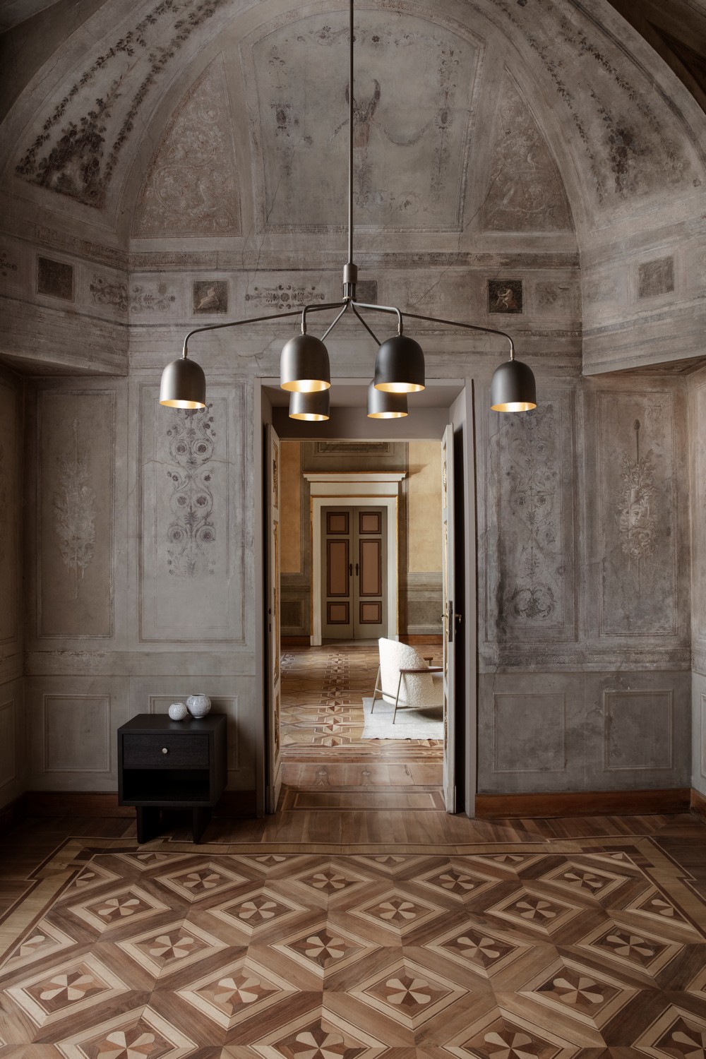 A chandelier designed with a strong, industrial-modern aesthetic, inspired by the architecture and character of New York’s Howard Hotel. It features six articulated arms and globes, providing adjustable, diffused light and a statement geometric presence.