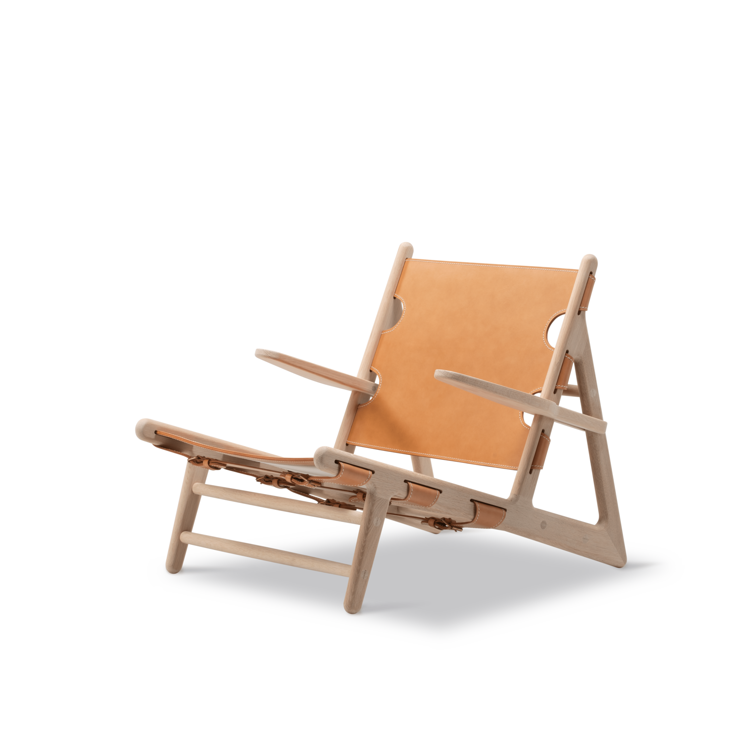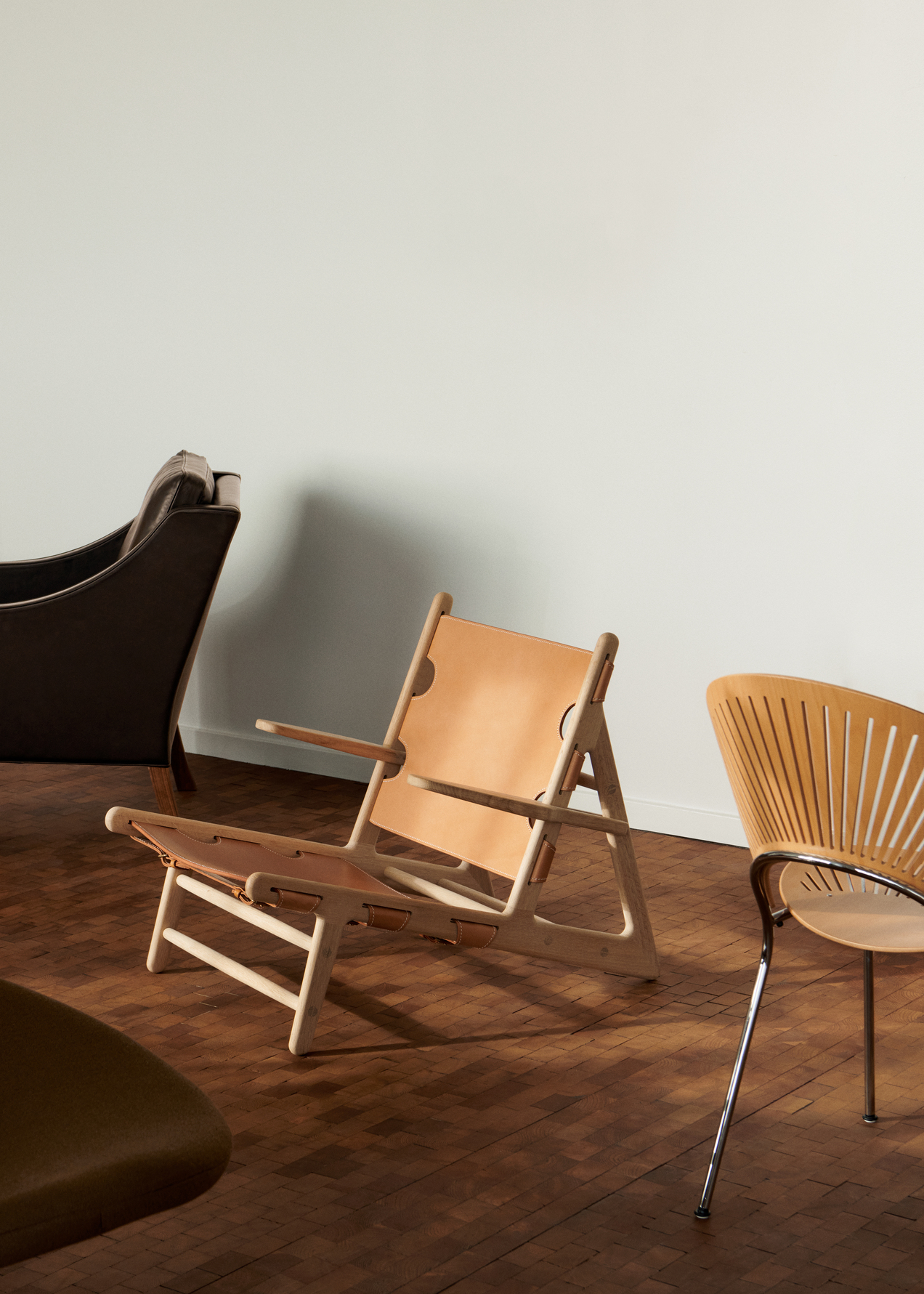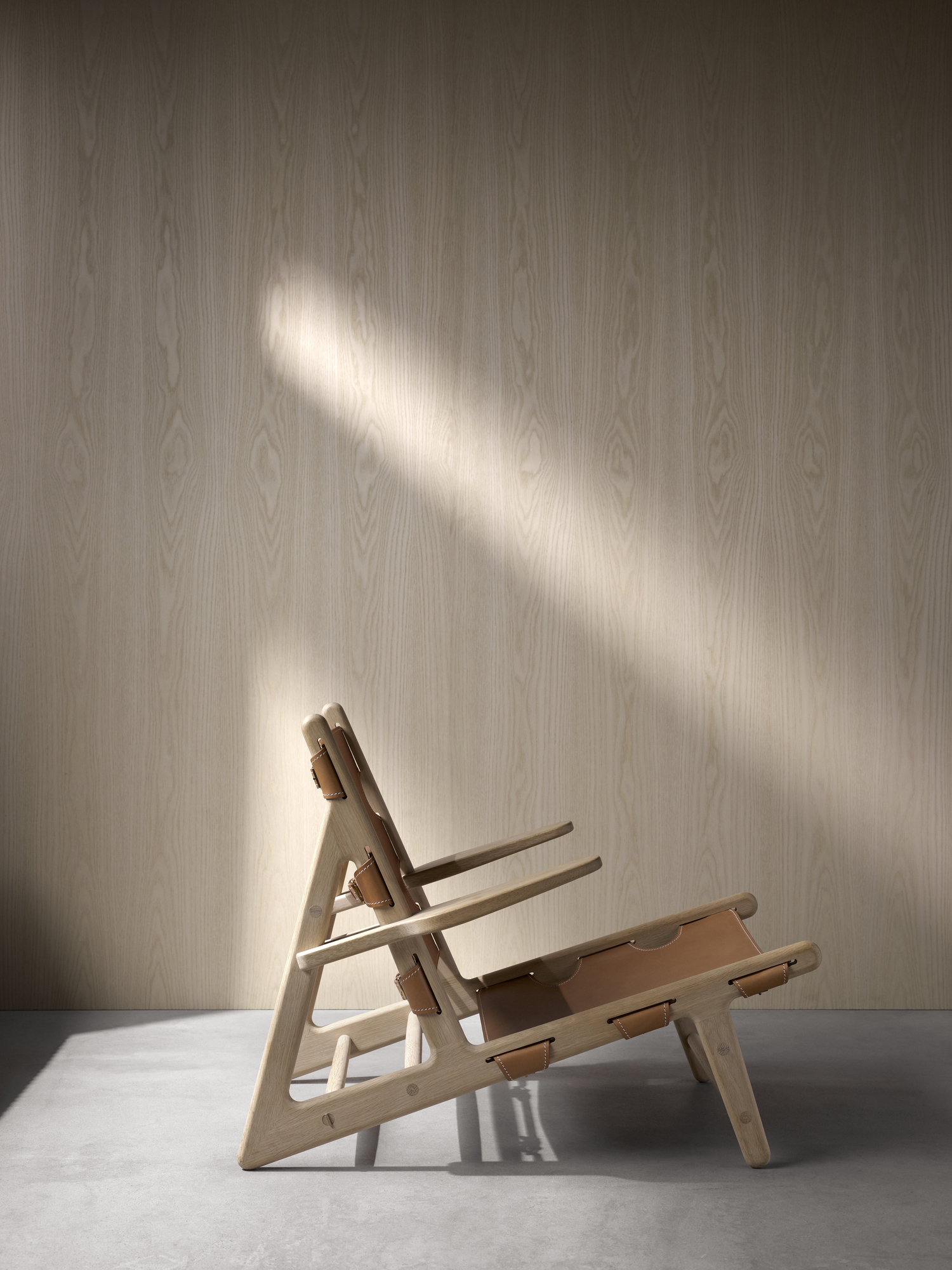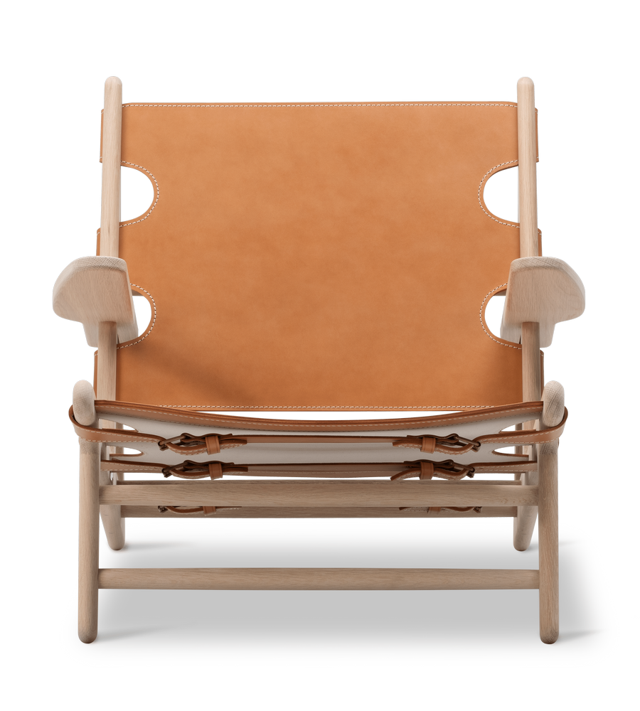 The Hunting Chair is a low-slung Danish icon with a bold diagonal profile, built in solid wood and vegetable-tanned saddle leather with buckles and belts.