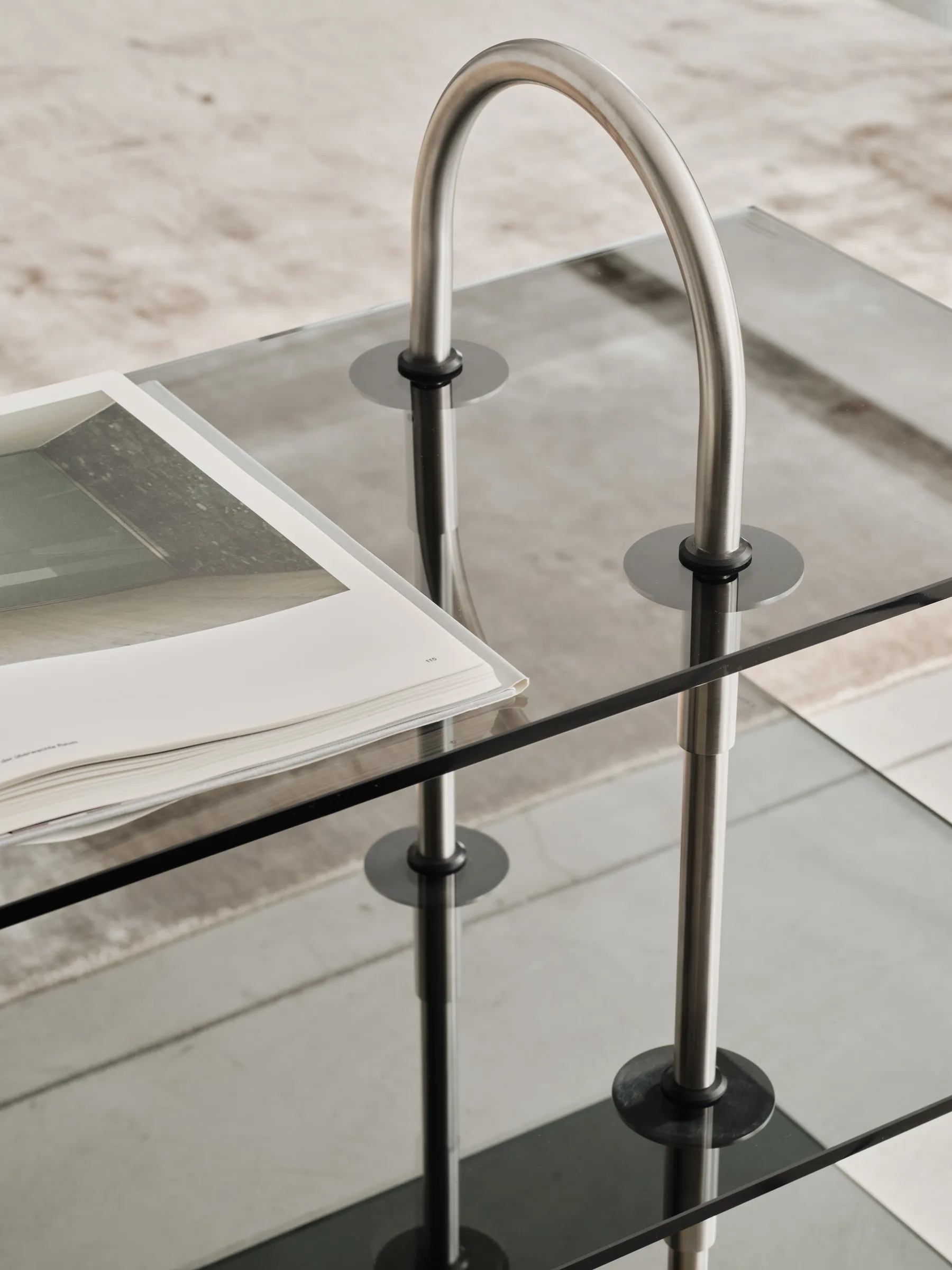 A modular, wall-mounted shelving system characterized by slim metal rods and arched brackets. Its minimal form and open structure provide a light, visually open, and customizable storage solution for both vertical and lateral expansion.