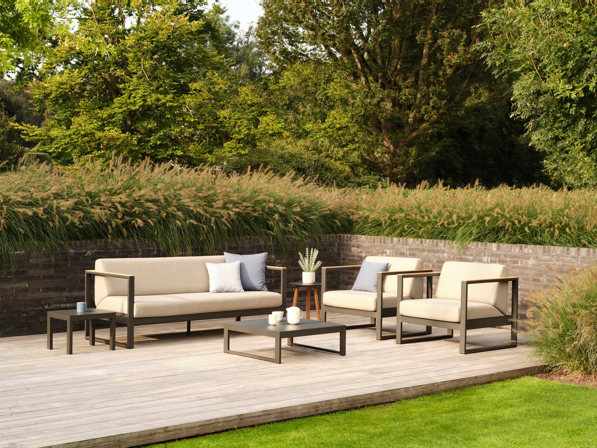 Landscape is a modular lounge system designed with a floating aesthetic. It features a sleek aluminum base with integrated teak slats that act as side tables. The collection focuses on versatility, allowing users to arrange corners and middle sections to fit any terrace size.