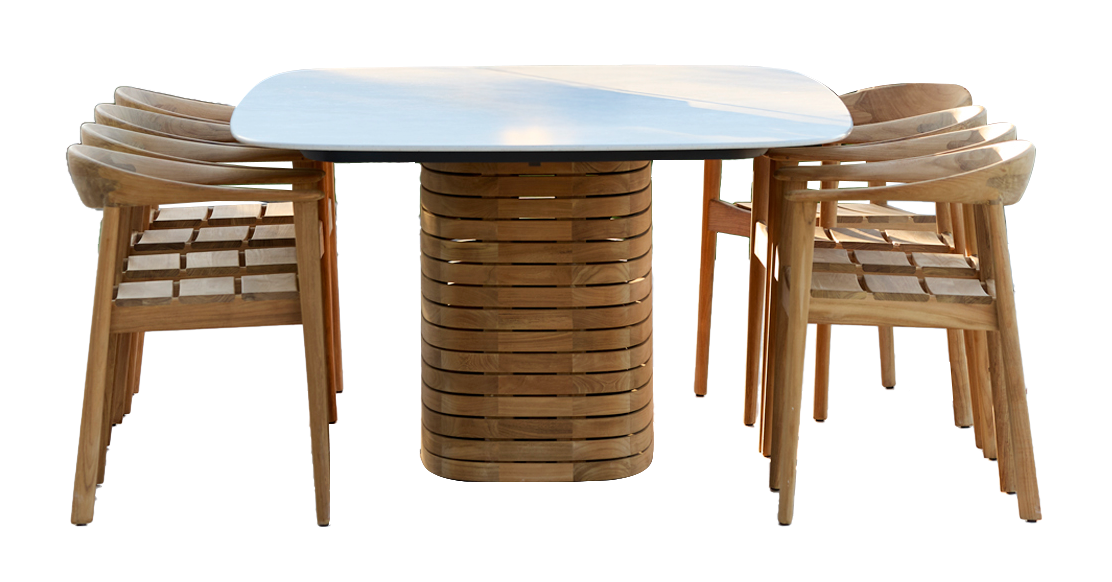 The tabletop offers ample space for family style dining and warm connection. The surface feels refined to the touch and is crafted from durable weather resistant materials that thrive in sun humidity and tropical rain. Colours remain consistent thanks to excellent lightfastness and the table requires minimal maintenance making it an effortless choice for modern outdoor living.
