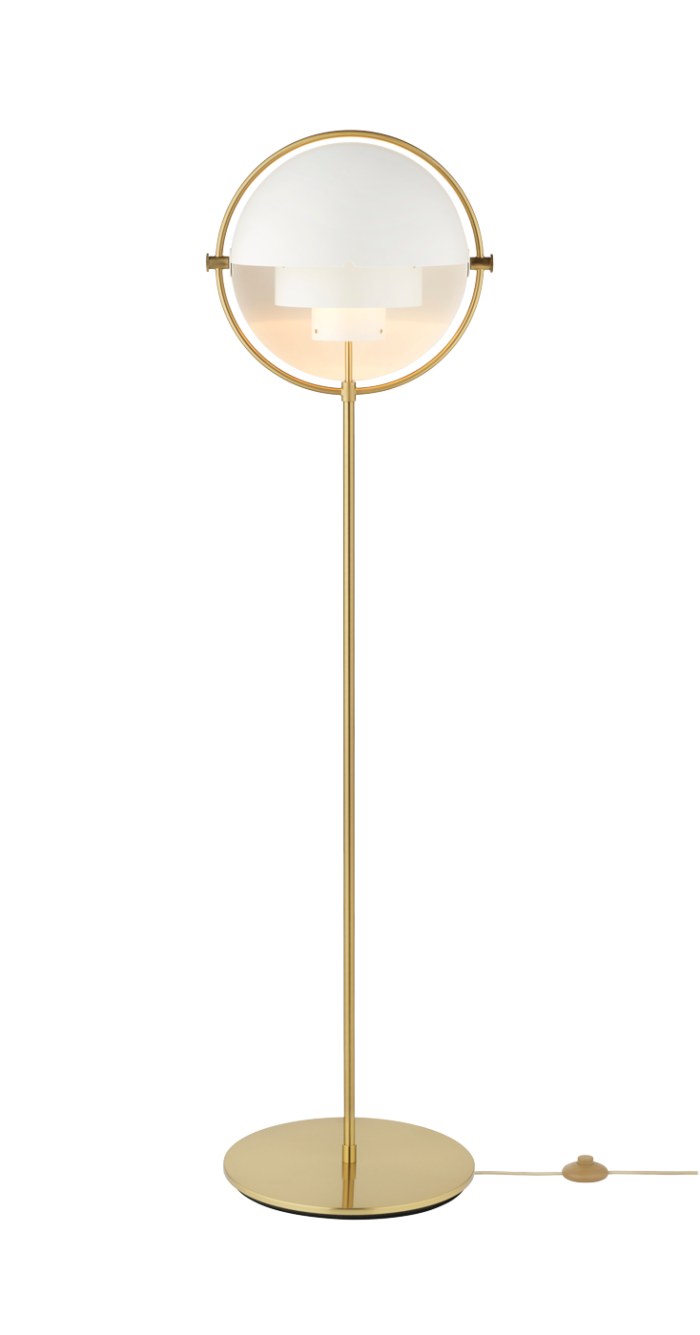 The floor version of the Multi-Lite is a striking vertical extension of the iconic design. It maintains the sculptural presence and features the rotatable outer shades, allowing the user to create various atmospheric and directional lighting effects.