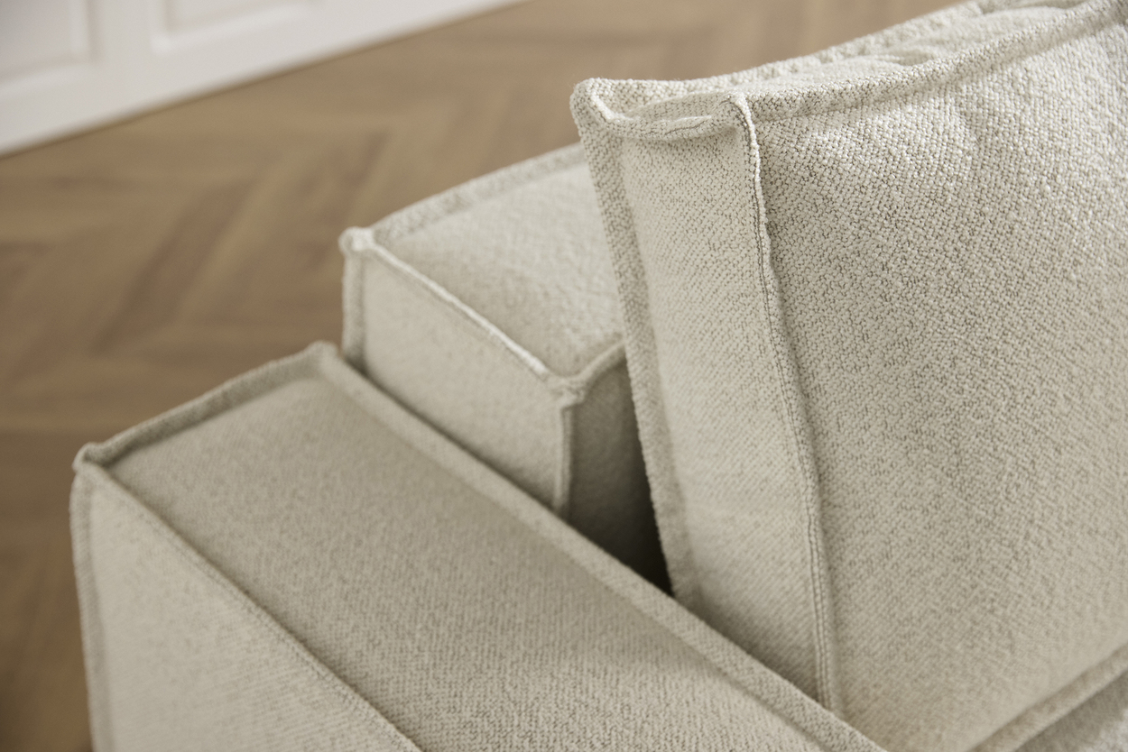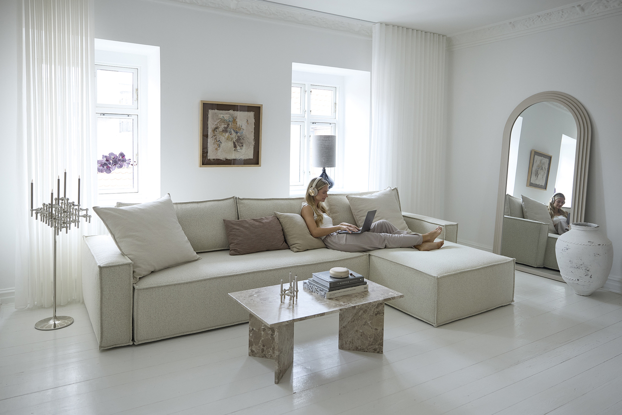 Newilla is a highly multifunctional lounger sofa bed with a peninsula, designed by Per Weiss. It is characterized by geometric shapes, soft padding, and practical fabrics. It stands out for its spacious layout and integrated, large storage container positioned under the seat, offering significant space for household items. With a simple movement, the four-seater sofa with peninsula transforms into a comfortable double bed. It is built with a no-zag and pocket spring mattress system and features fully removable, machine-washable covers.