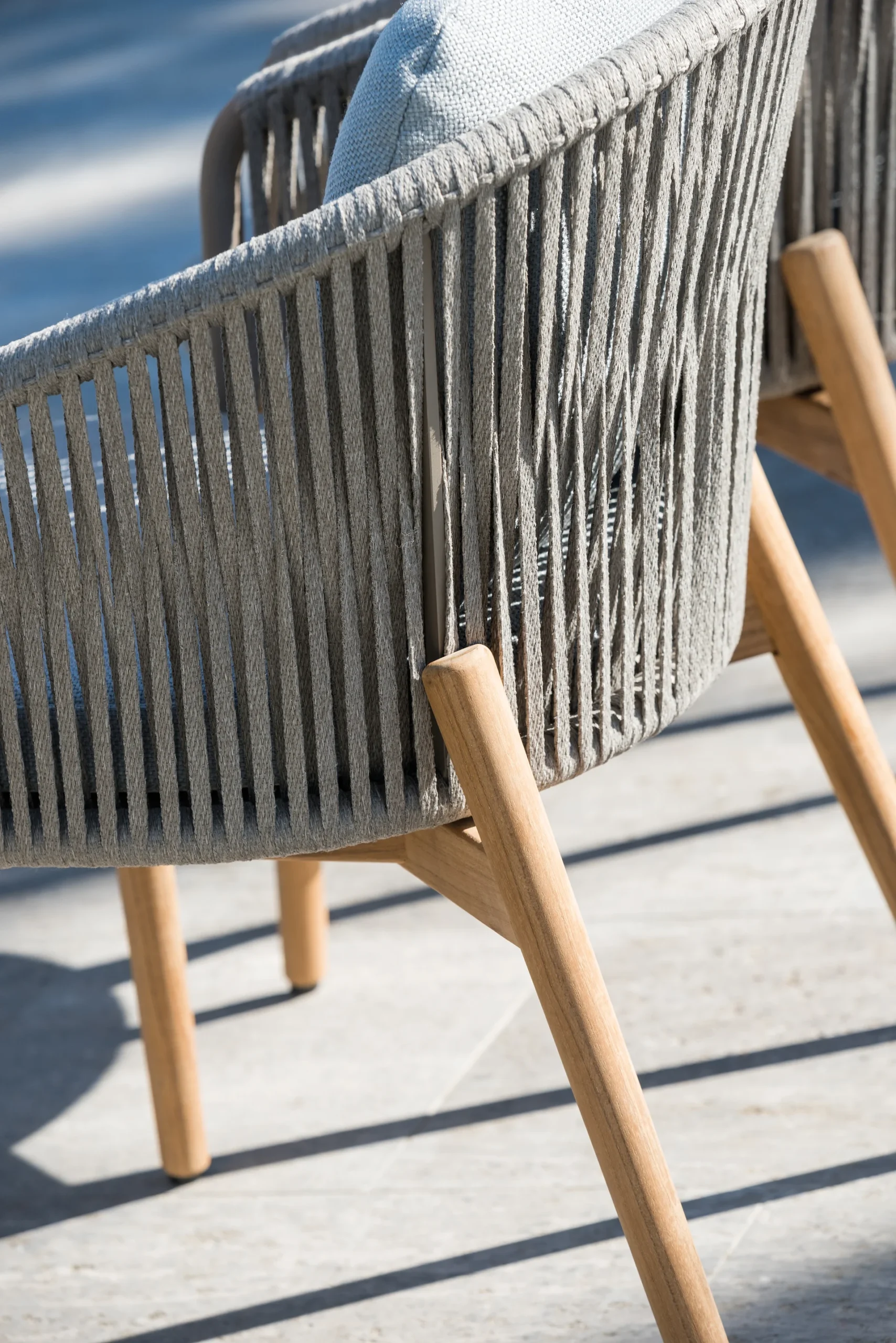 Newport offers deep, inviting seating with a handcrafted look. It combines an intriguing mix of woven straps and teak to create a warm, luxurious feel. The dining chair is designed to be paired with either teak or aluminum tables, bringing a contemporary twist to a timeless classic.