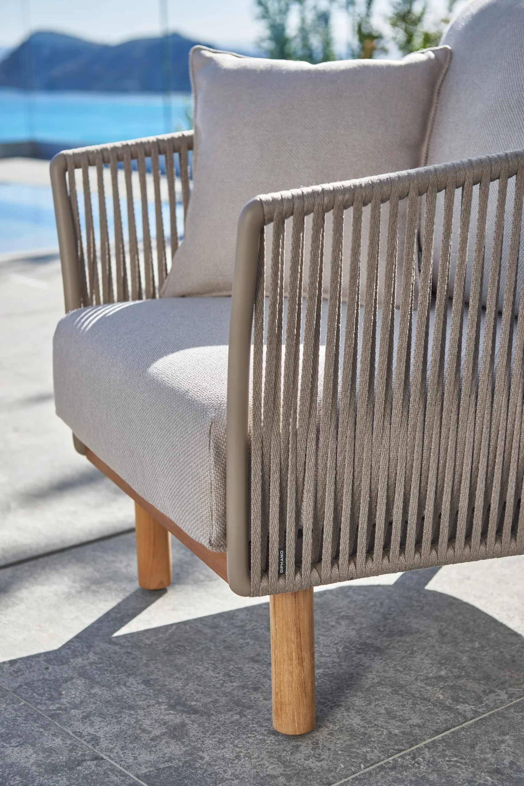 Defined by its soft and plush 15 cm thick cushions, the Newport lounge chair is the ultimate piece for relaxation. The woven rope details on the backrest provide a textured contrast to the smooth teak and aluminum frame, creating a tone-on-tone or contrasting look depending on fabric choice.