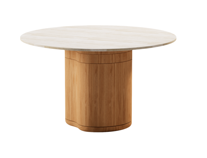 The Manutti Ogado Dining Table is a round outdoor table combining a sculptural brushed-teak base with a Travertine Crema top for warm tactility, cool stone luxury, and long-life outdoor durability.