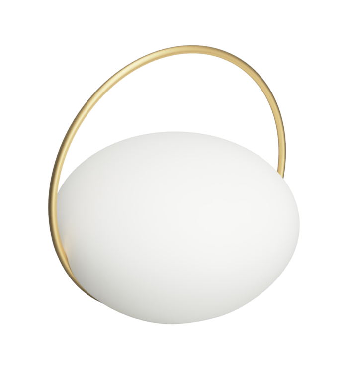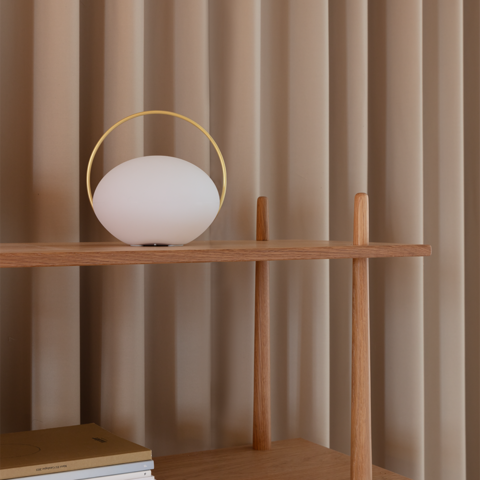 The Orbit Lamp is a portable, wireless lamp in milky white with brass accents, delivering up to 20 hours of warm glow indoors or outdoors.