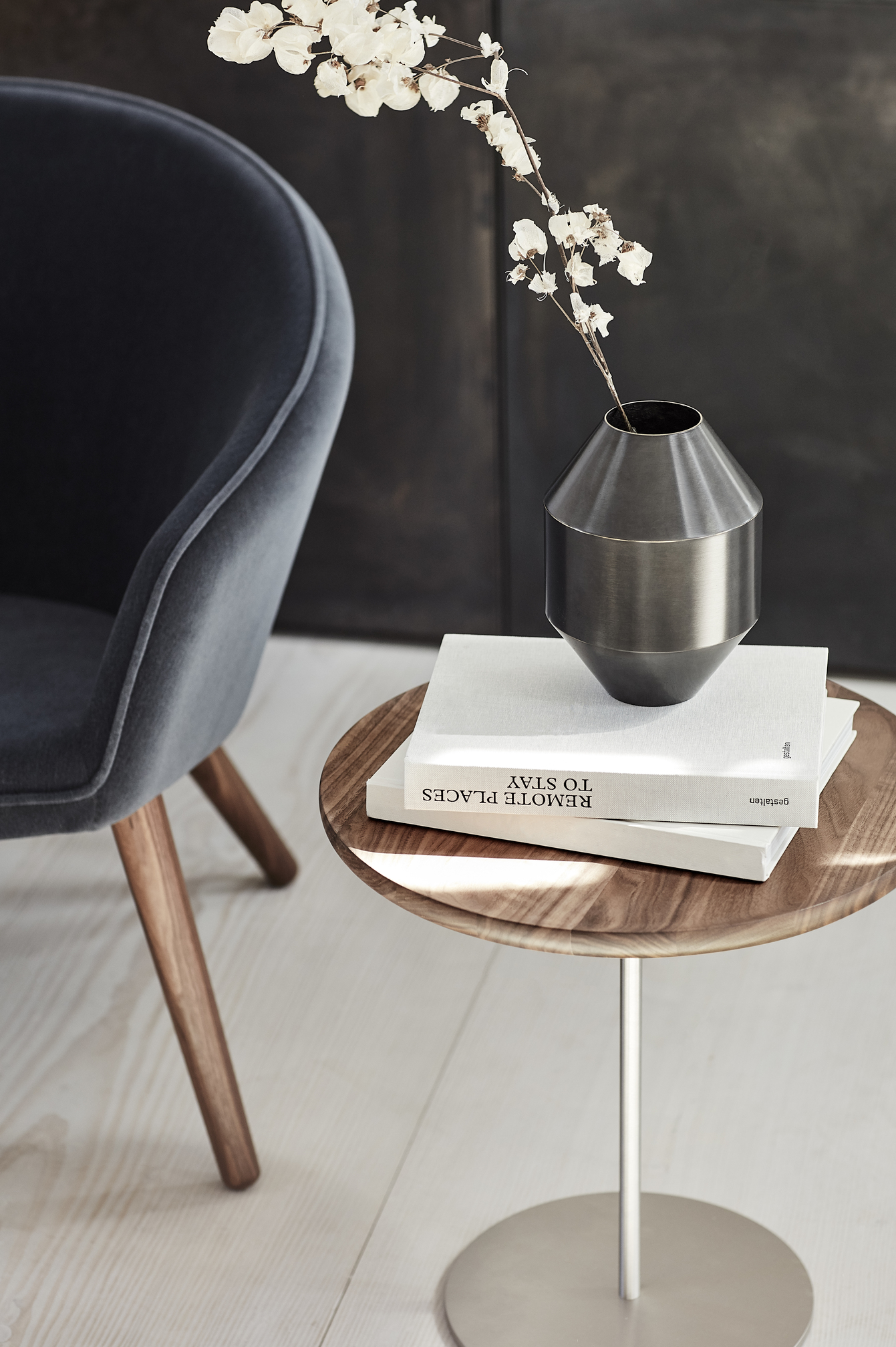 The Pal Side Table is a versatile, understated side table with a tray-like solid-wood top and an ultra-slim steel stem.